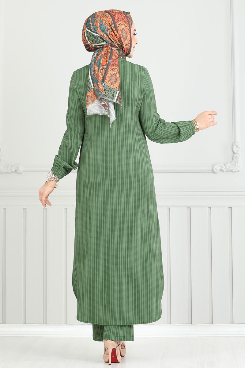 المنتج لديه ياقة دائرية. المنتج به أزرار جيزلي. البلوز تحتوي على فتحة. غير مبطنة. البلوزة غير متضمنة. صُنعت عينة من المجموعة مع البلوزة لإظهار الاستخدام المقصود للمنتج. خصر البنطال مرن. السوار مطاطي. قد يكون هناك اختلاف في الدرجة اللونية في المنتج بسبب التقاط الصور الفوتوغرافية.