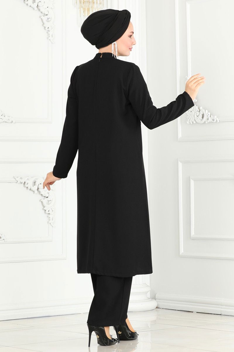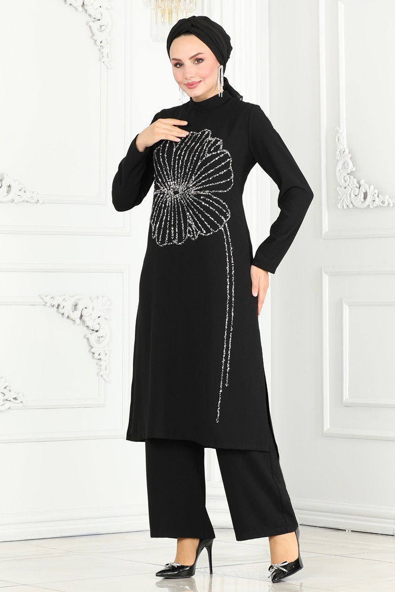 المنتج لديه ياقة بيضوية. البلوز تحتوي على فتحة. غير مبطنة.. المنتج به سحاب في جزء من الخلف. يتم لصق الحجارة. خصر البنطال مرن. قد يكون هناك اختلاف في الدرجة اللونية في المنتج بسبب التقاط الصور الفوتوغرافية.