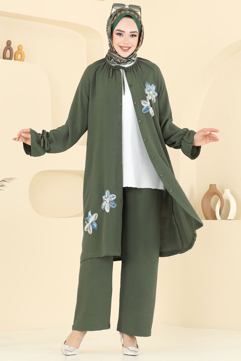المنتج لديه ياقة دائرية. المنتج به أزرار من الأمام. غير مبطنة. تفاصيل الزهور مخيطة. اللاصقات تم خياطتها . تفاصيل الأربطة عبارة عن إكسسوارات. البلوزة غير متضمنة. صُنعت عينة من المجموعة مع البلوزة لإظهار الاستخدام المقصود للمنتج. خصر البنطال مرن. مع حزام بأربطة. قد يكون هناك اختلاف في الدرجة اللونية في المنتج بسبب التقاط الصور الفوتوغرافية.