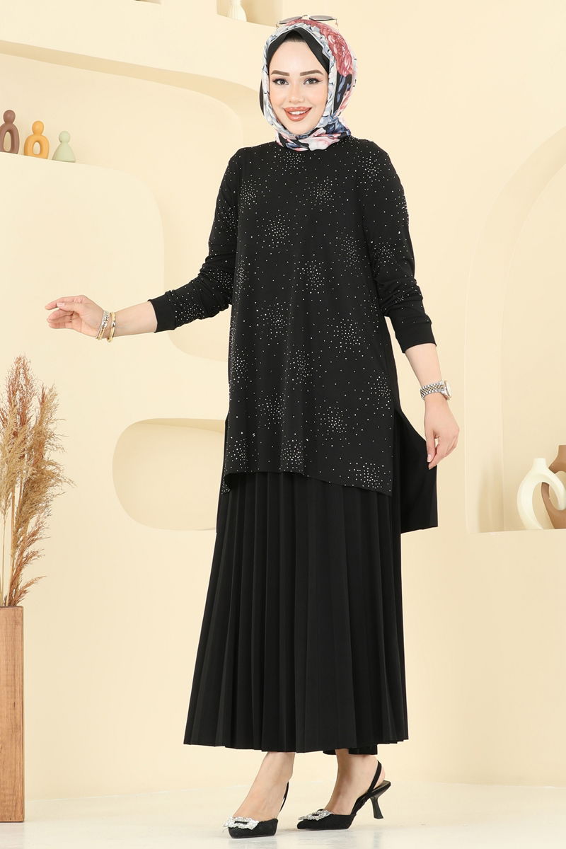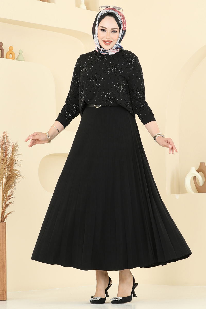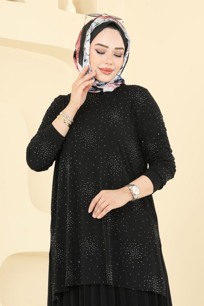Product Feature : It is a new season hijab fashion product. The tunic has a side slash.. Unlined. The stones are glued. Belt is not included. The skirt waist is elastic. There may be a tonal difference in the product due to concept photo shoots.