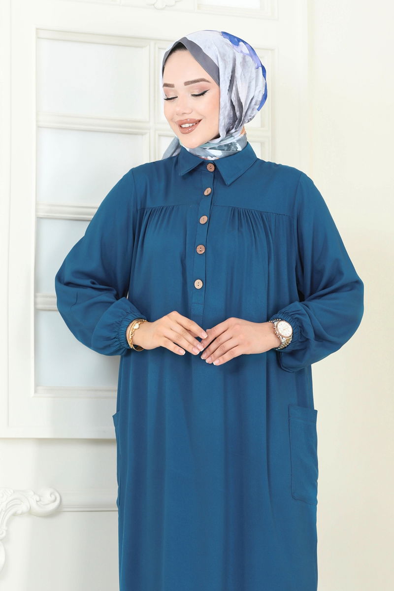 Product Feature : It is a new season hijab fashion product. The product has a Shirt collar. The product has half front buttons. The tunic has a side slash.. Unlined. There is a pocket on the tunic. The waist of the trousers is elastic. The cuff is rubberized. There may be a tonal difference in the product due to concept photo shoots.
