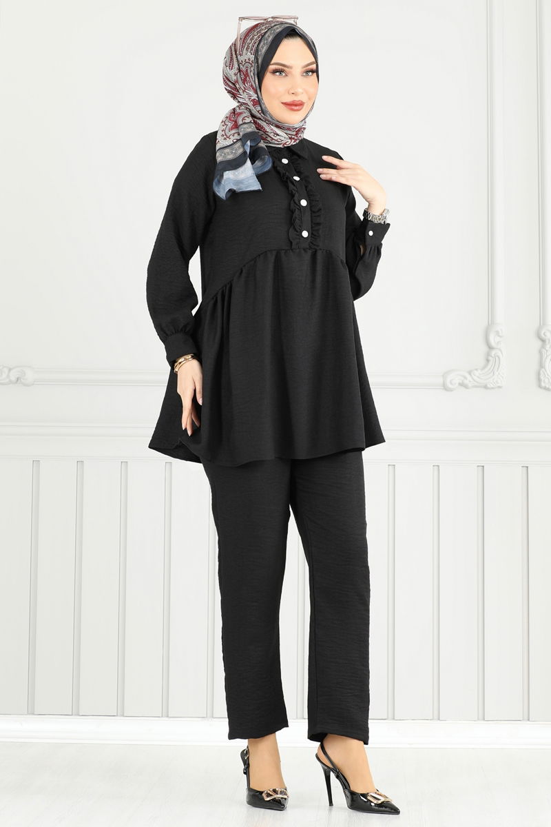 Product Feature : It is a new season hijab fashion product. The product has a Shirt collar. The product has half front buttons. Unlined. The waist of the trousers is elastic. Cuff buttons are active. There may be a tonal difference in the product due to concept photo shoots.