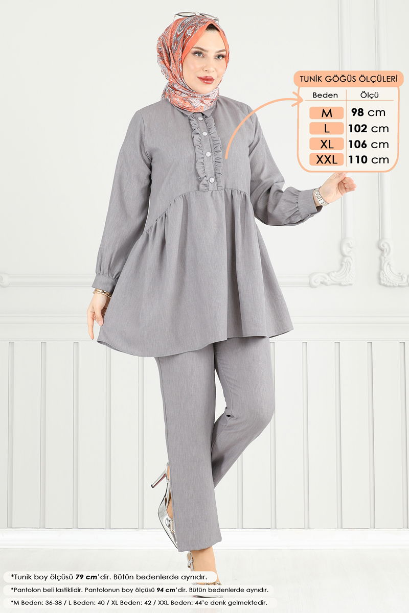 Product Feature : It is a new season hijab fashion product. The product has a Shirt collar. The product has half front buttons. Unlined. The waist of the trousers is elastic. Cuff buttons are active. There may be a tonal difference in the product due to concept photo shoots.