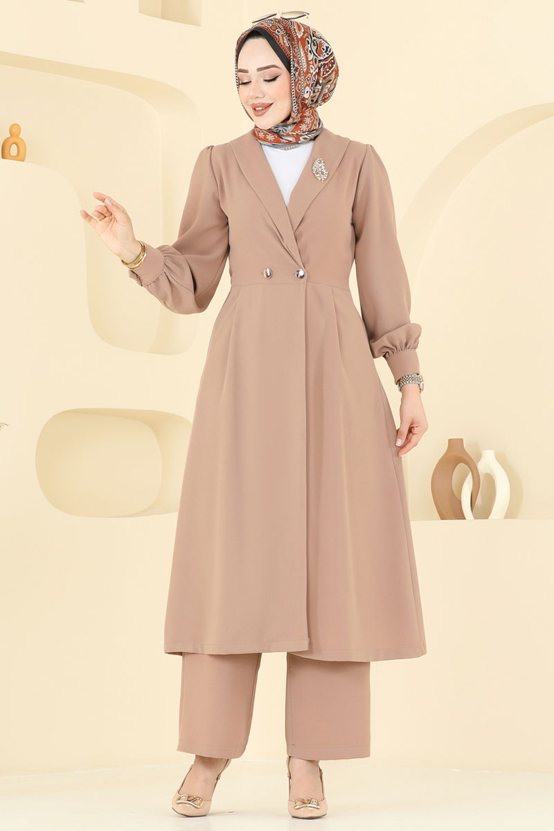 يوجد زر مزدوج يمكن استخدامه من الأمام. المنتج لديه ياقة مفتوحة. غير مبطنة. المنتج يحتوي على حزام خصر مُخاط. الملحقات غير متضمنة. البلوزة غير متضمنة. صُنعت عينة من المجموعة مع البلوزة لإظهار الاستخدام المقصود للمنتج. الجيب متاح. خصر البنطال مرن. أزرار الكفة نشطة. قد يكون هناك اختلاف في الدرجة اللونية في المنتج بسبب التقاط الصور الفوتوغرافية.