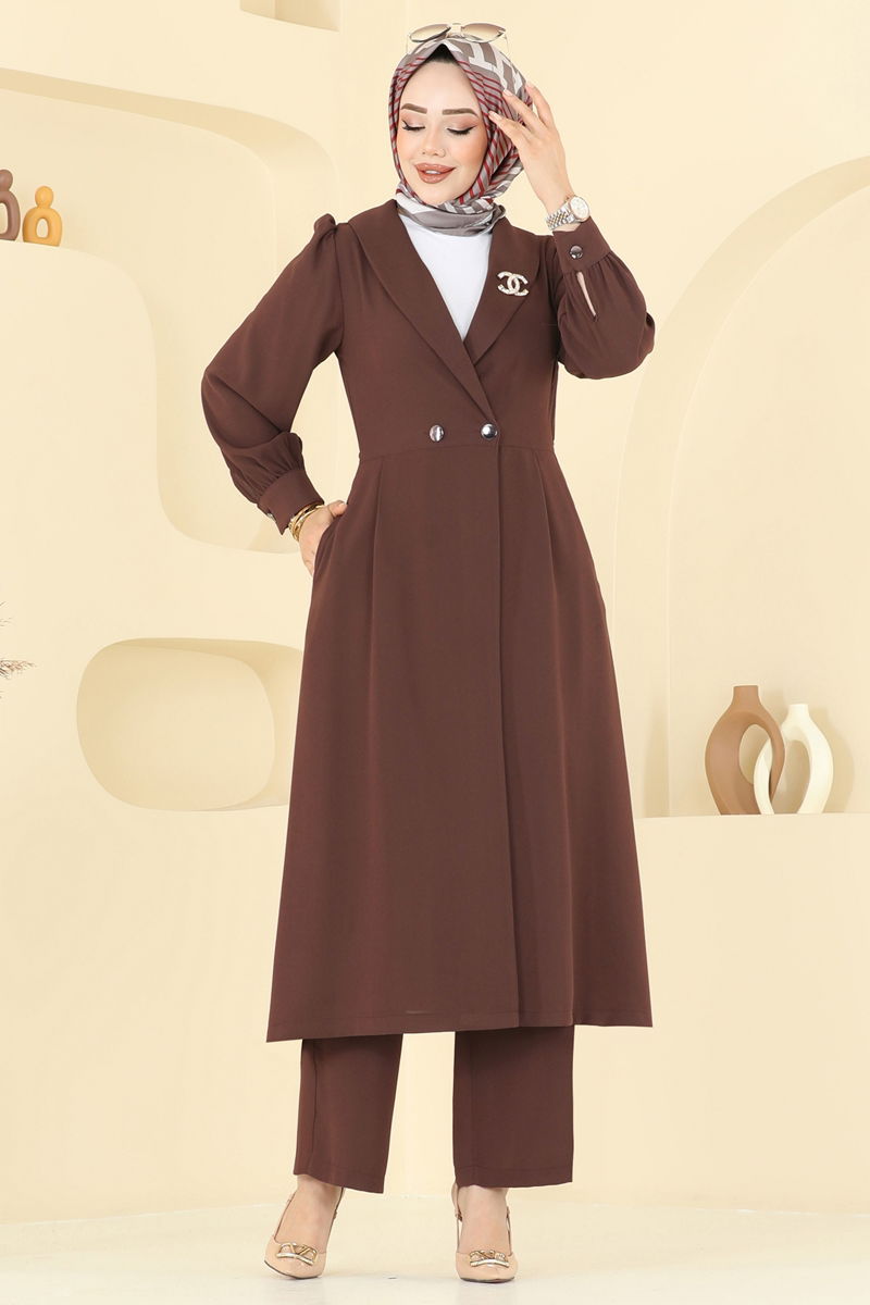 يوجد زر مزدوج يمكن استخدامه من الأمام. المنتج لديه ياقة مفتوحة. غير مبطنة. المنتج يحتوي على حزام خصر مُخاط. الملحقات غير متضمنة. البلوزة غير متضمنة. صُنعت عينة من المجموعة مع البلوزة لإظهار الاستخدام المقصود للمنتج. الجيب متاح. خصر البنطال مرن. أزرار الكفة نشطة. قد يكون هناك اختلاف في الدرجة اللونية في المنتج بسبب التقاط الصور الفوتوغرافية.
