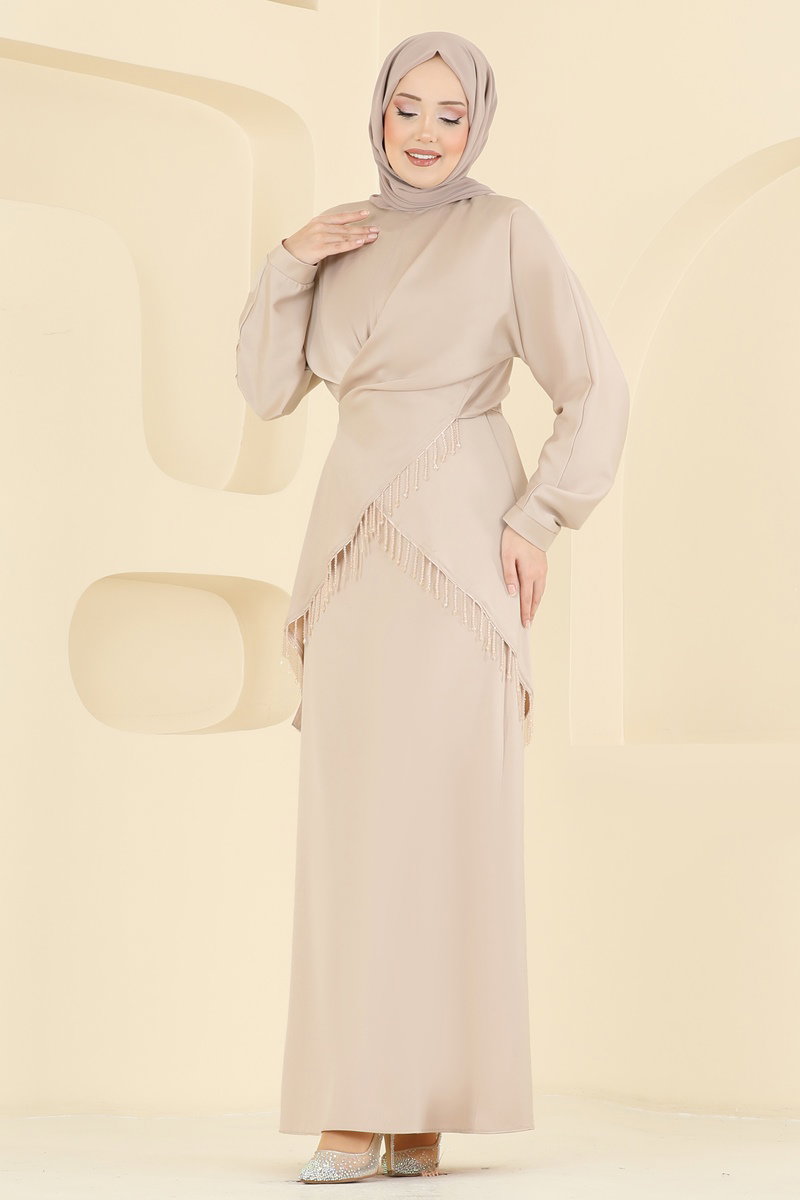The Elegant Blouse and Satin Suit is a chic choice for modest fashion. Suitable for all seasons, this ensemble requires dry cleaning and offers comfort with its collarless design and non-lined structure. It features a zipper at the back and meticulous bead detailing, ensuring an eye-catching look. The product displayed is in size 38, providing a perfect fit to complete your elegance.