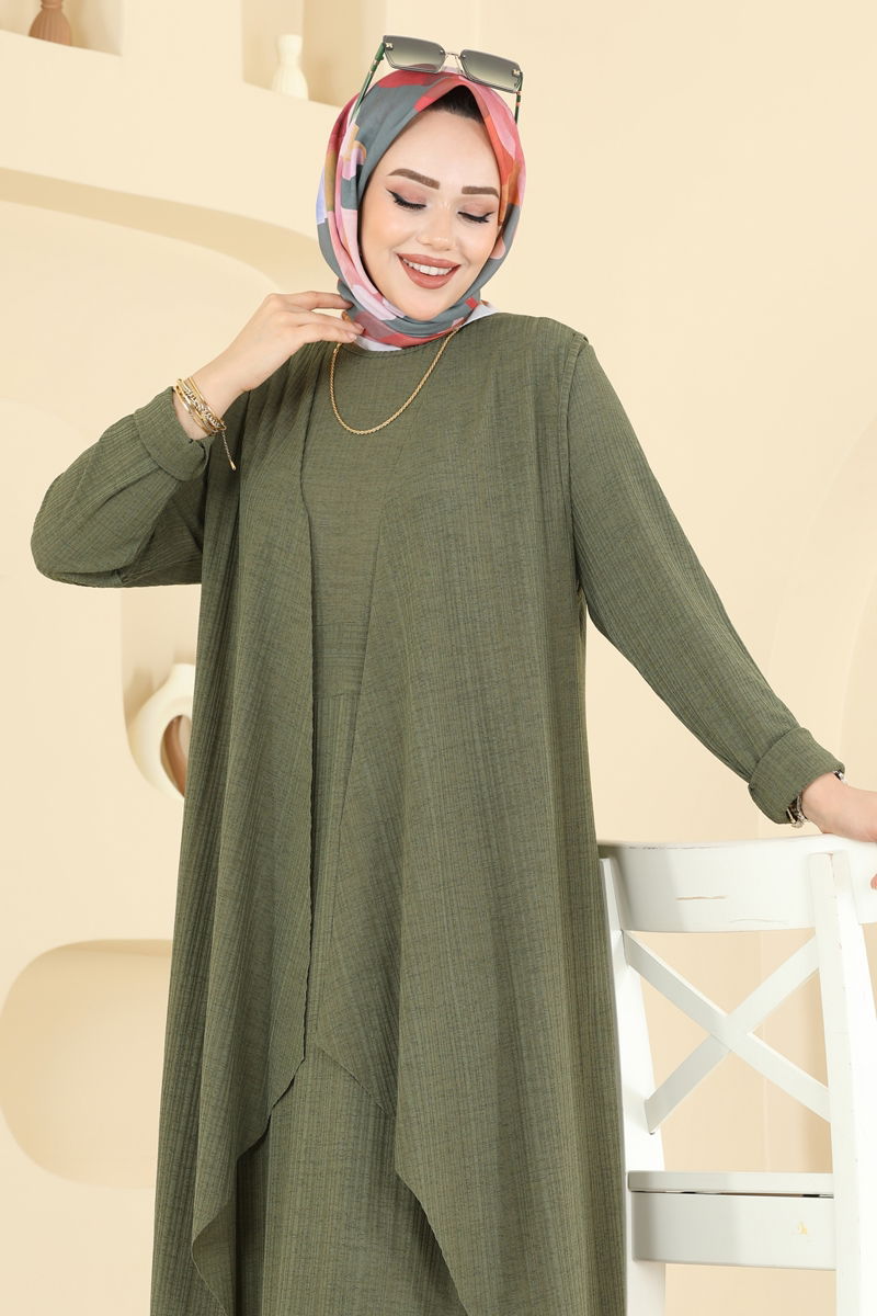 The Asymmetric Vest Knit Set is specially designed for the modest fashion style. Suitable for all seasons, this set can be comfortably worn any time of the year and is machine washable at 30 degrees on a gentle cycle. Featuring a crew neck and without lining, this product combines elegance with comfort. The dress has long sleeves and a seamed waist. This combination, which includes both a vest and a dress, is set to be an essential part of your wardrobe. The product on the model is size 40, but it is available in various sizes.