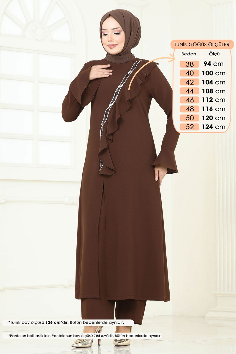 المنتج لديه ياقة دائرية. يحتوي على فتحة. غير مبطنة. المنتج به سحاب في جزء من الخلف. يتم لصق الحجارة. خصر البنطال مرن. قد يكون هناك اختلاف في الدرجة اللونية في المنتج بسبب التقاط الصور الفوتوغرافية.