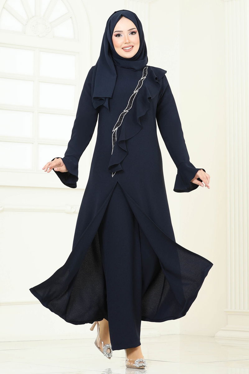 Product Feature : It is a new season hijab fashion product. The product has a Cycling collar. It has a slash.. Unlined. The product has a zipper at the from the back part. The stones are glued. The waist of the trousers is elastic. There may be a tonal difference in the product due to concept photo shoots.