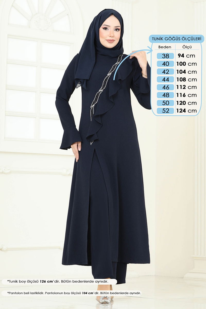 Showcase your elegance throughout all seasons with the Stone Front Modest Suit, featuring details that bring out your grace. Made from crepe fabric, this set includes a zipper-back, unlined modest top with a mandarin collar and comfortable elastic waist pants. The stone details on the tunic add a captivating sparkle. Recommended for dry clean only, this suit can be comfortably chosen for any season. Ideal for both everyday and special occasions, this modest suit will complete your style.