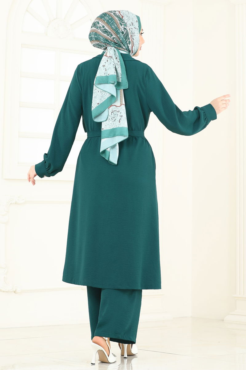 The Bolero Detailed Aerobin Suit is a stylish and modern hijab-friendly outfit suitable for all seasons. It can be washed at 30 degrees on a gentle cycle, made from superb aerobin fabric. This suit features a cross-over neckline and is unlined, displayed in size 38 on the model. The belt is designed with sewn ends to prevent waviness and is included with the suit but its use is optional. The blouse is not included, used only for styling purposes in the pictures. The trousers have elasticated waist and for comfort.
