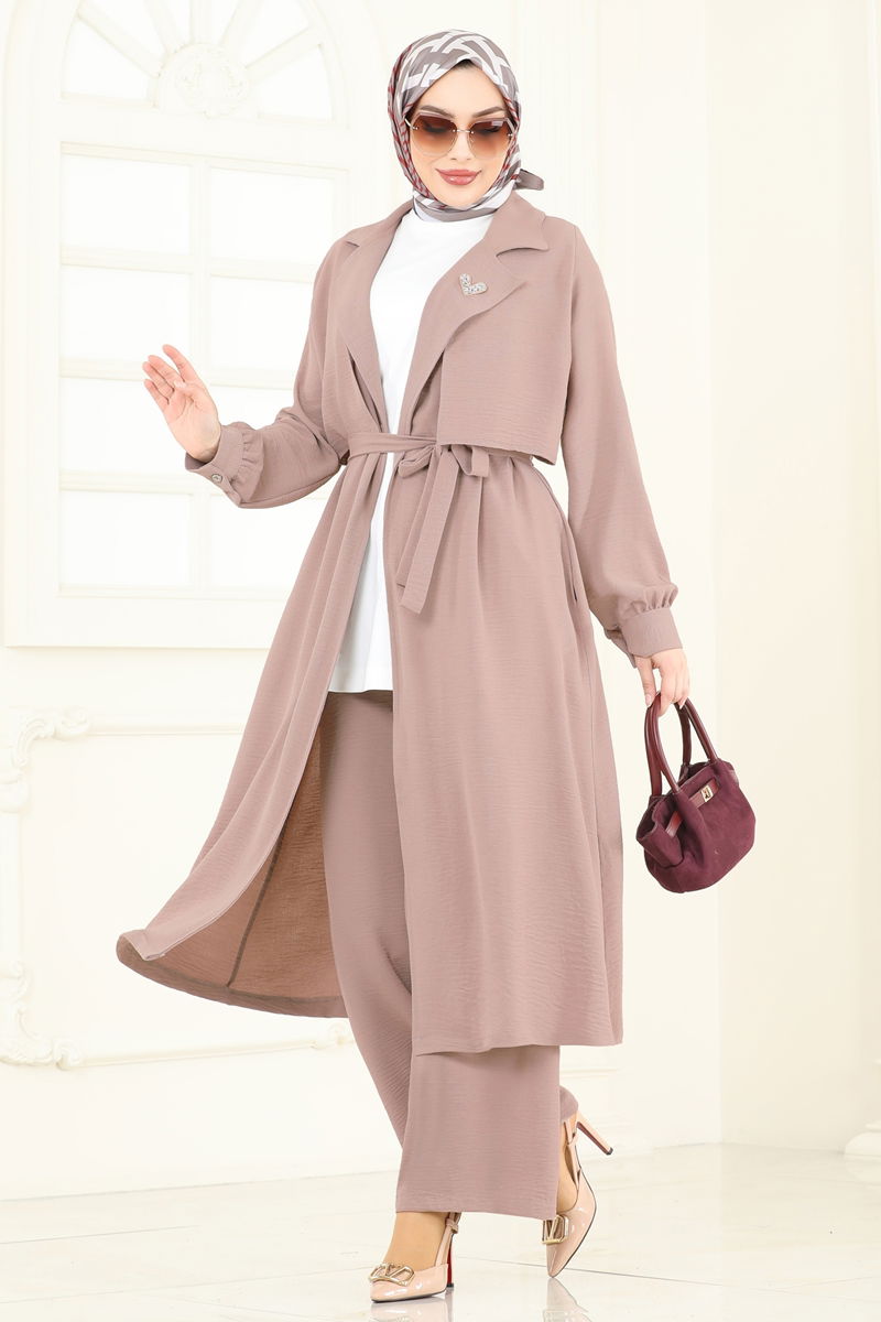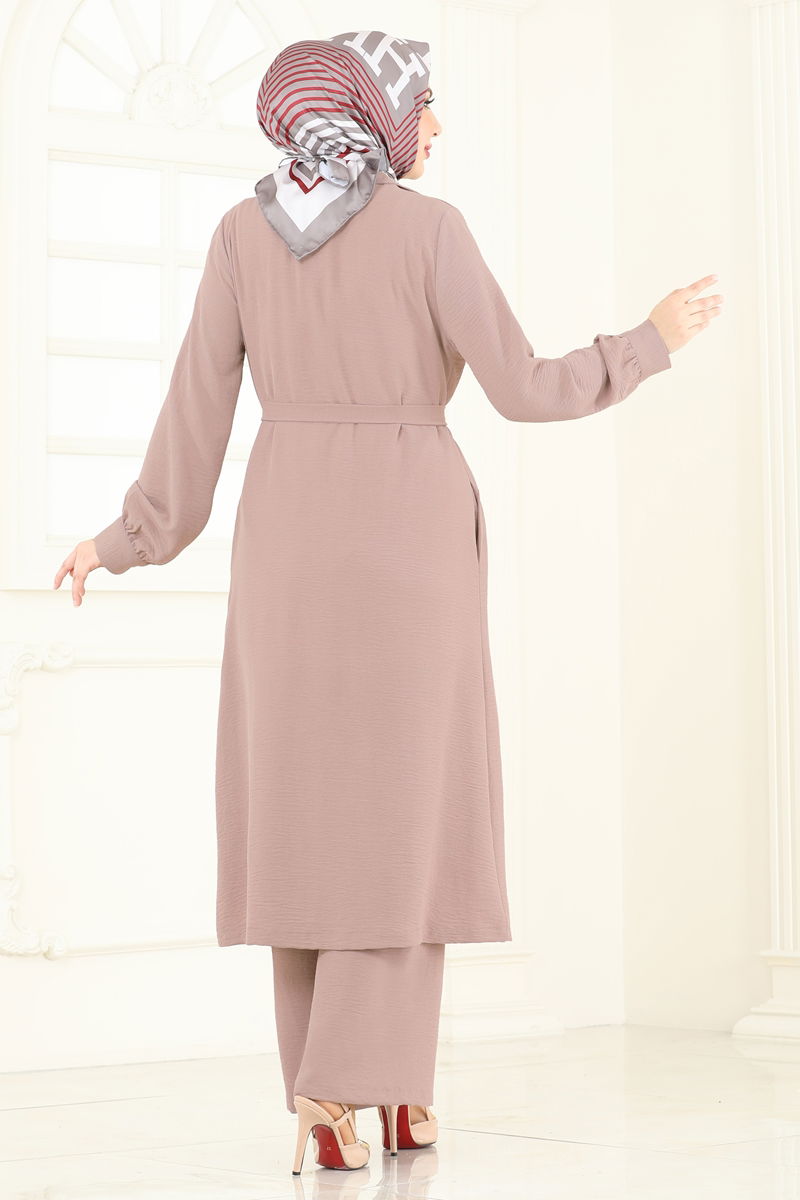 المنتج لديه ياقة مفتوحة. غير مبطنة. الحزام متضمن، ،يمكن استخدامها حسب الرغبة البلوزة غير متضمنة. صُنعت عينة من المجموعة مع البلوزة لإظهار الاستخدام المقصود للمنتج. الملحقات غير متضمنة. يتميز البنطال بخصر وأساور مطاطية. أزرار الكفة نشطة. قد يكون هناك اختلاف في الدرجة اللونية في المنتج بسبب التقاط الصور الفوتوغرافية.