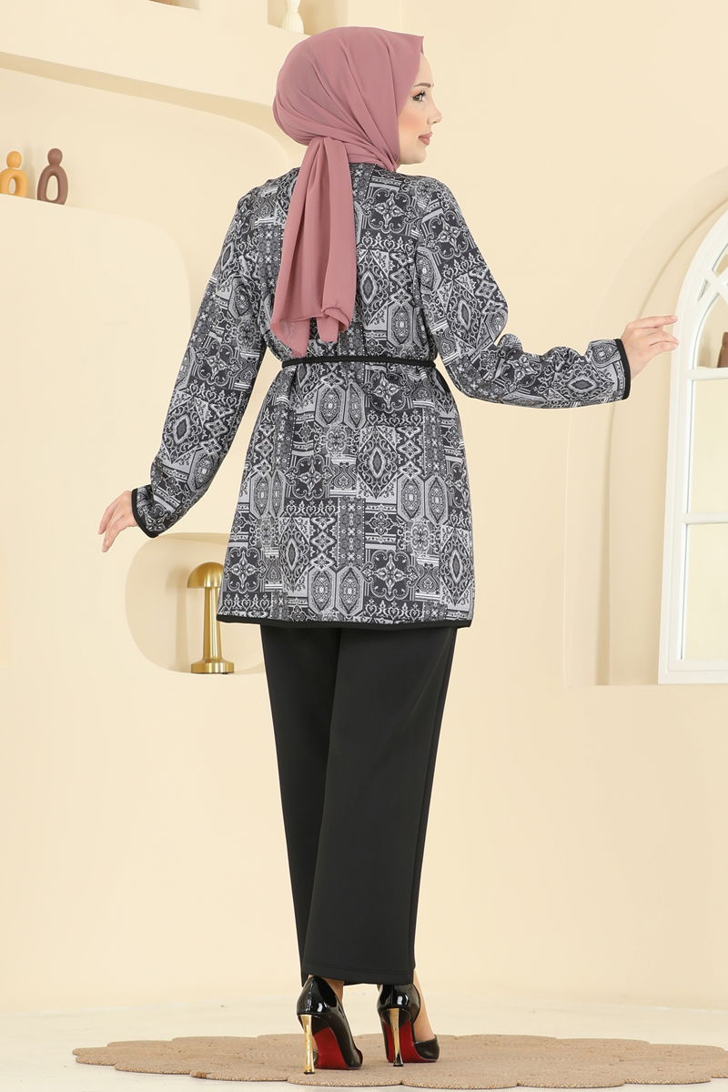 The Ethnic Patterned Scuba Set offers comfort and elegance throughout all seasons. Washable at 30 degrees with gentle care, this modest wear ensemble features a button-front design and is unlined for ease of use. Offered in size M, it is enhanced with optional tie details and has an elastic waistband on the trousers for all-day comfort. Designed as both a top and pants, it provides a comfortable and stylish appearance.