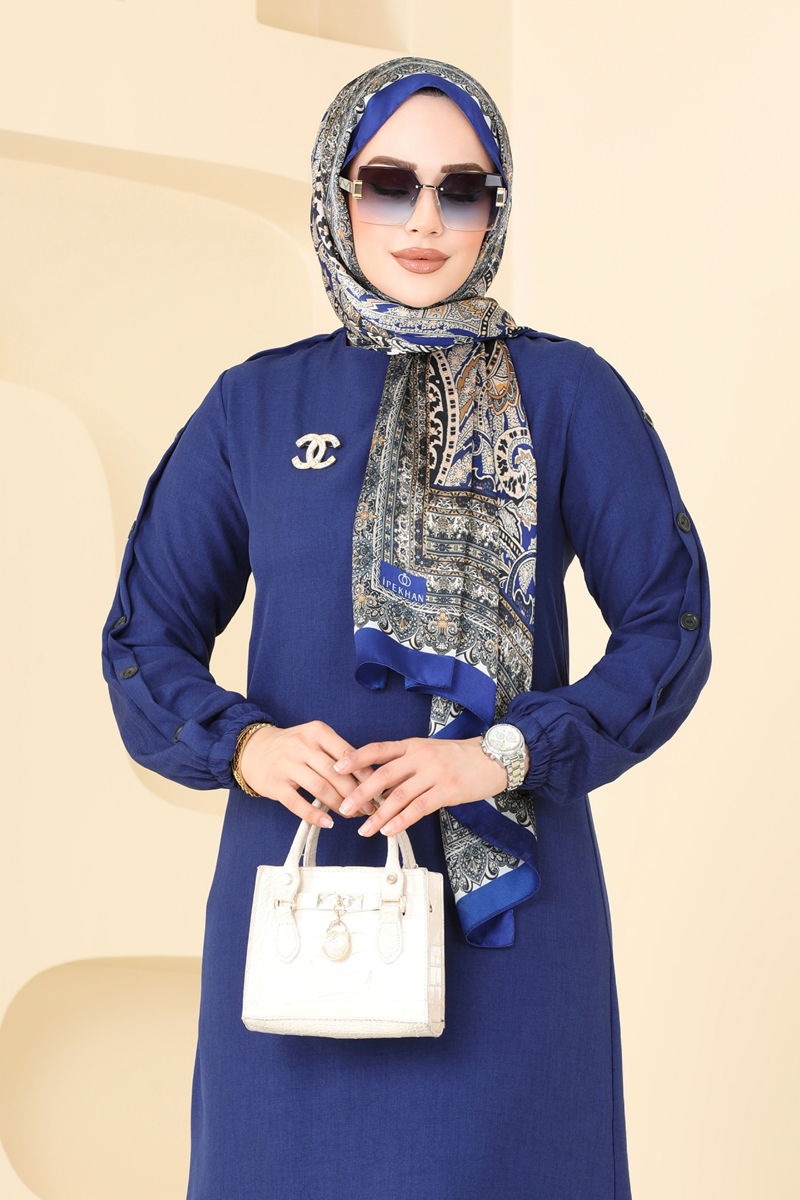 The Epaulet Detail Linen Suit is an ideal choice for sophisticated and modern modest fashion. Suitable for all seasons, this suit offers both comfort and style with its Sofia linen fabric. It is washable at 30 degrees on a gentle cycle, unlined, and features a back zipper for ease of use. The crew neck, button details, and elastic waistband on the trousers provide both comfort and an aesthetic look. The elastic cuffs on the tunic and trousers ensure freedom of movement. Key measurements of the model: height 165 cm, chest 88 cm, waist 68 cm, hips 99 cm, and weight 56 kg.