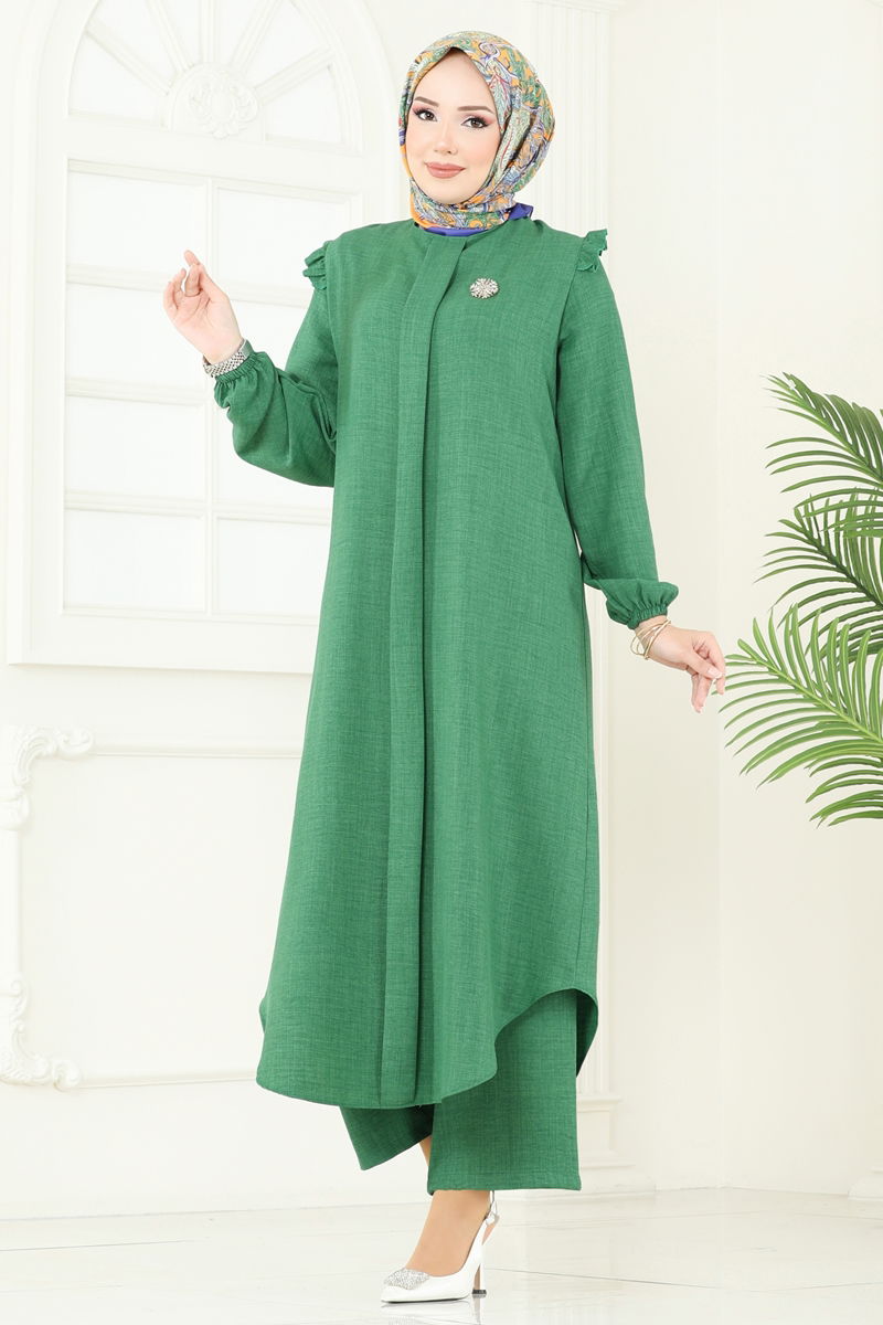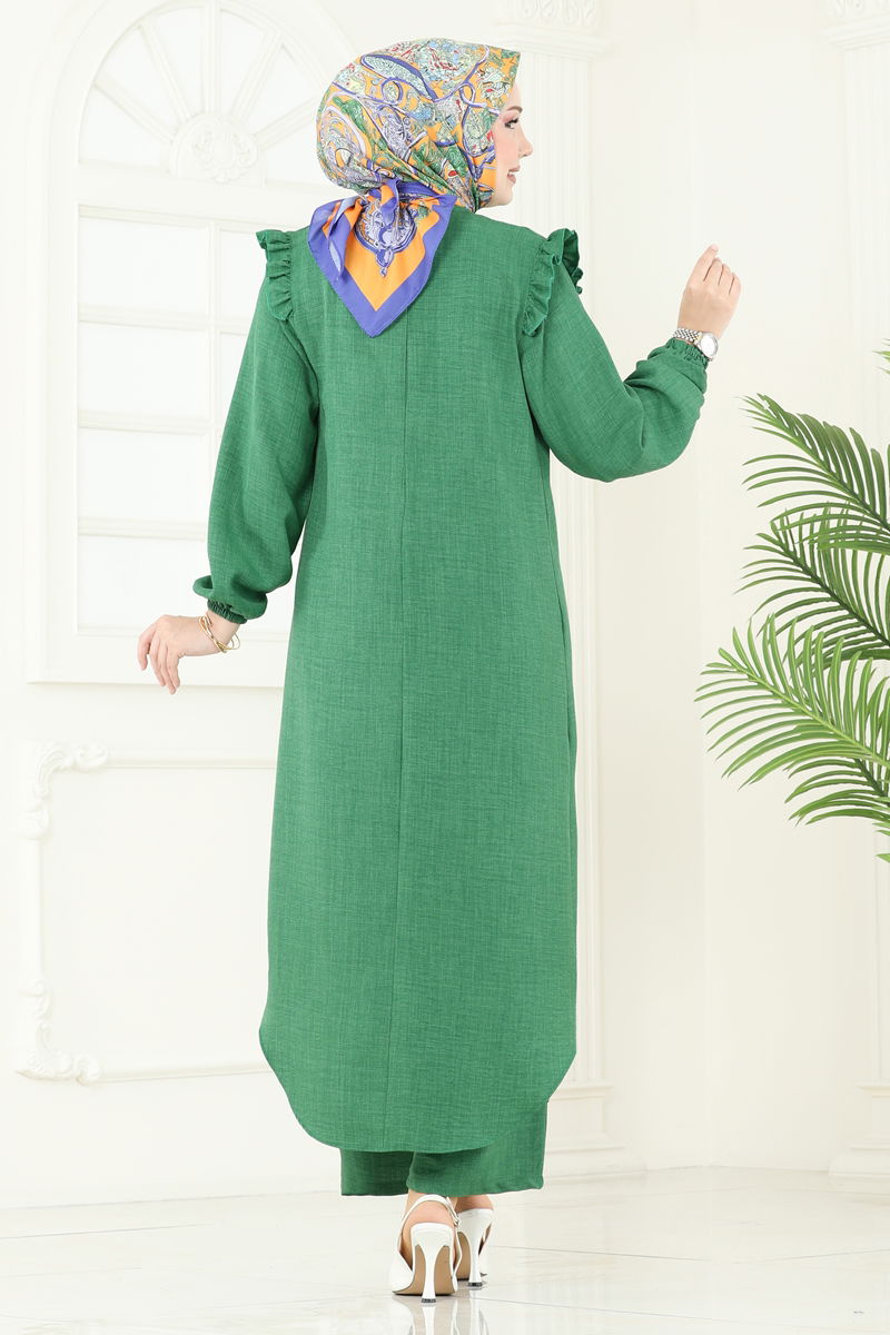 Featuring ruffle details, the Double Set is a stylish and modern hijab outfit suitable for all seasons. This product, which requires delicate washing, can be washed at 30 degrees and is made from Sofia Linen fabric. With a crew neck design and unlined structure, it prioritizes comfort. The waist of the tunic and pants is elastic, offering ease of use. Elastic cuffs also make this combination both chic and comfortable.