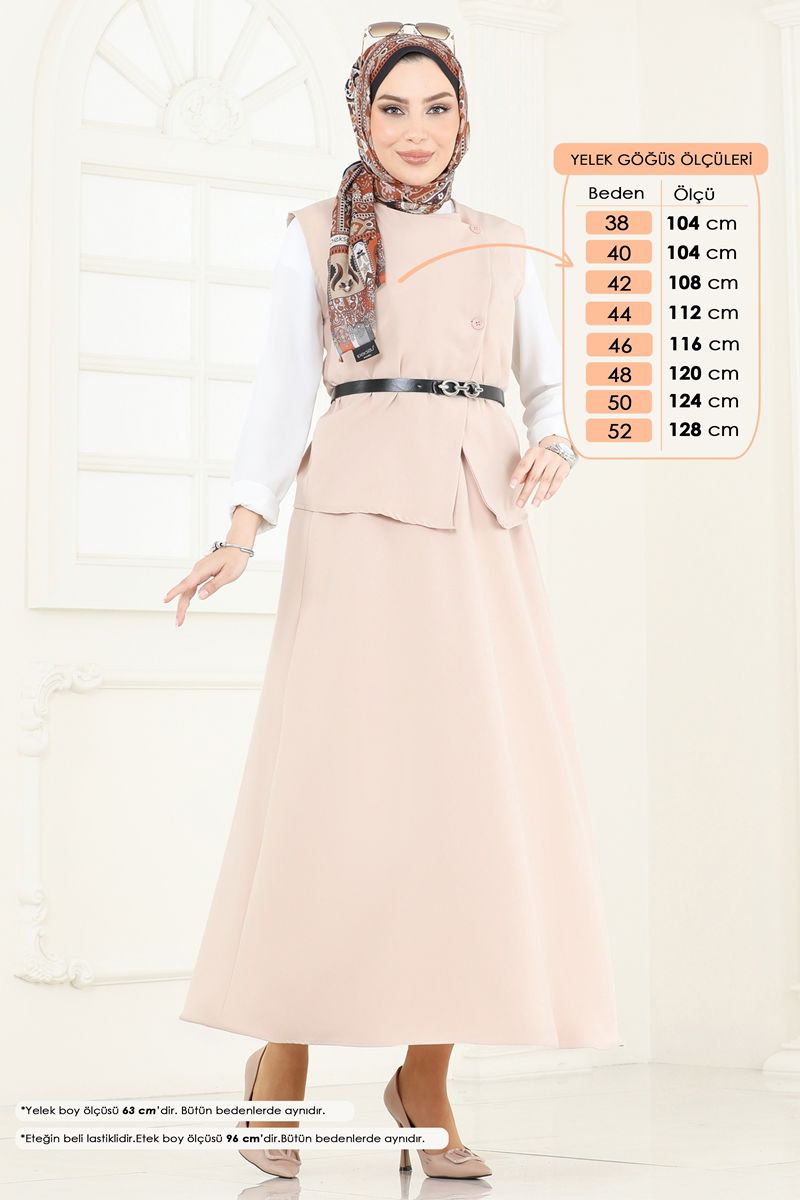This chic Belted Skirt Suit is a perfect addition to your modest wear collection! It can comfortably be worn in all seasons and requires gentle washing at 30 degrees. Made from durable Dabıl fabric, this suit features a jacket collar and front button detailing. Unlined, the look is enhanced by a belt detail; the belt’s ends are sewn to prevent waving, leaving the middle part seamlessly open. The belt is optional and not mandatory to use. The blouse is not included in the set. The skirt’s elastic waist ensures comfort. Enjoy combining both style and practicality throughout the seasons with this modest outfit. Length: 167 cm, Chest: 90 cm, Waist: 70 cm, Hips: 100 cm, Weight: 59 kg.