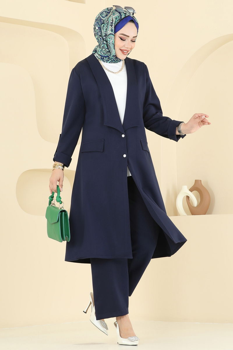 المنتج لديه ياقة السترة. المنتج به أزرار نصف أمامي. غير مبطنة. تفاصيل الجيب عبارة عن إكسسوارات. خصر البنطال مرن. قد يكون هناك اختلاف في الدرجة اللونية في المنتج بسبب التقاط الصور الفوتوغرافية.