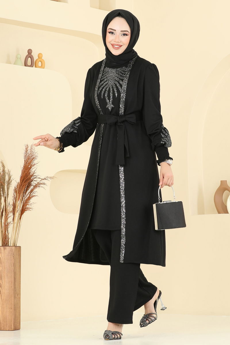 The Sequin Detail Team is a modest clothing product suitable for use across all seasons. Recommended to be washed gently at 30 degrees, this product is made from durable dabıl fabric. It offers a modern look with a crew neck and unlined design. The practical button at the back, sequin details, and an attached cardigan enhance its elegance. The included belt, which is optional, and the elastic waistband of the pants provide comfort.