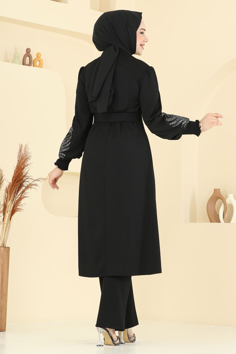 Product Feature : It is a new season hijab fashion product. It has a button that can be used from the back. The product has a Cycling collar. Unlined. Sequin sequin detail is sewn. Cardigan is sewn to the product. Belt included, optional not available. The waist of the trousers is elastic. There may be a tonal difference in the product due to concept photo shoots.