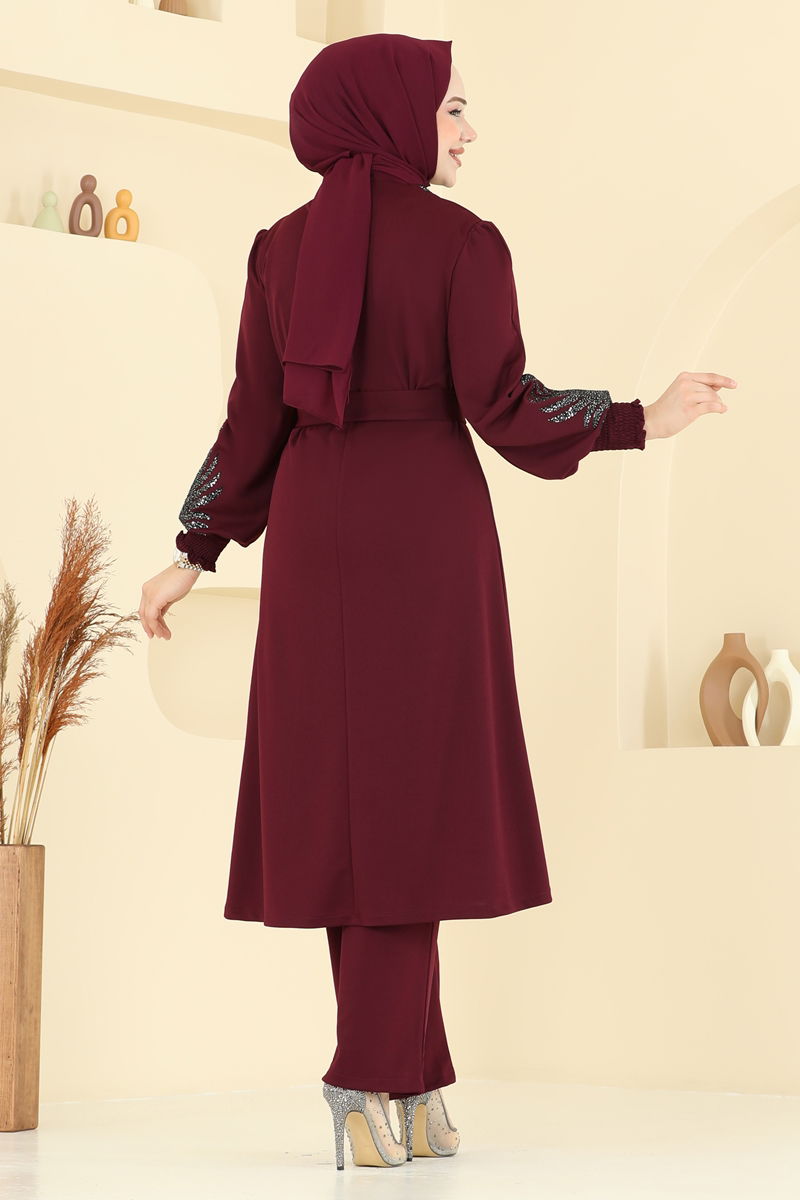 Product Feature : It is a new season hijab fashion product. It has a button that can be used from the back. The product has a Cycling collar. Unlined. Sequin sequin detail is sewn. Cardigan is sewn to the product. Belt included, optional not available. The waist of the trousers is elastic. There may be a tonal difference in the product due to concept photo shoots.