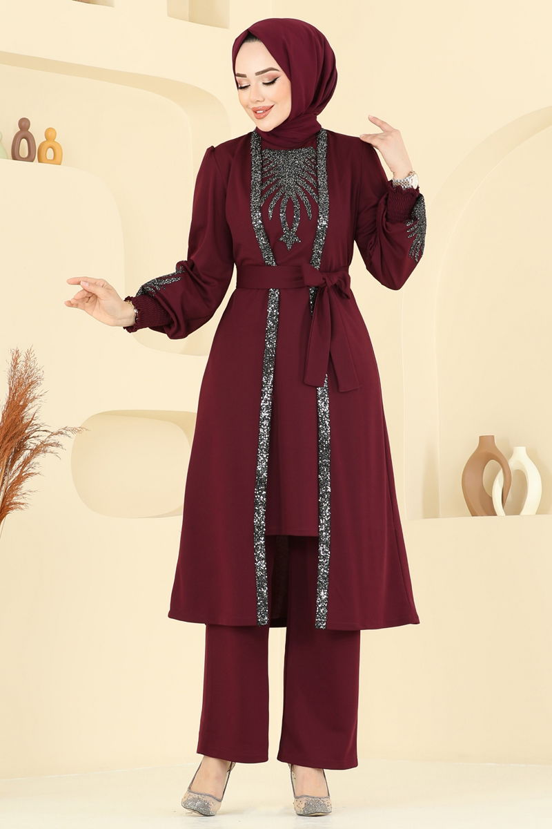 يوجد زر يمكن استخدامه من الخلف. المنتج لديه ياقة دائرية. غير مبطنة. تفاصيل الترتر اللامع تم خياطته سترة صوفية مخيطة على المنتج. الحزام متضمن، ،يمكن استخدامها حسب الرغبة خصر البنطال مرن. قد يكون هناك اختلاف في الدرجة اللونية في المنتج بسبب التقاط الصور الفوتوغرافية.