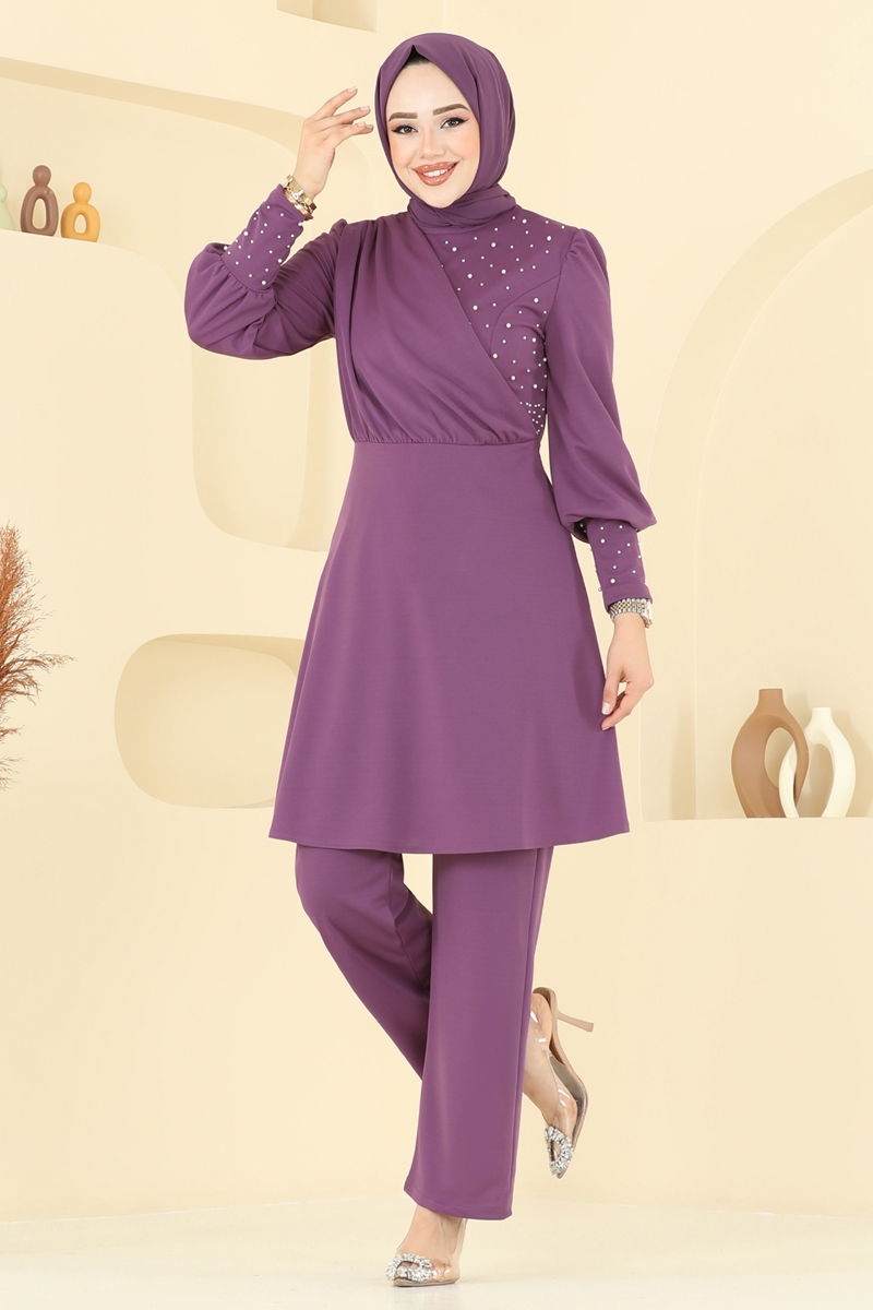 Chic and modern, the Pearl Detail Two-Piece Set merges elegance and comfort in modest wear. Suitable for all seasons, this product can be washed gently at 30 degrees. Made from knitted Dabil fabric, this set features a crew neck and is unlined. The back has a zipper, and the pearl details provide a stunning appearance. The elastic waistband on both the tunic and pants ensures comfortable wear.