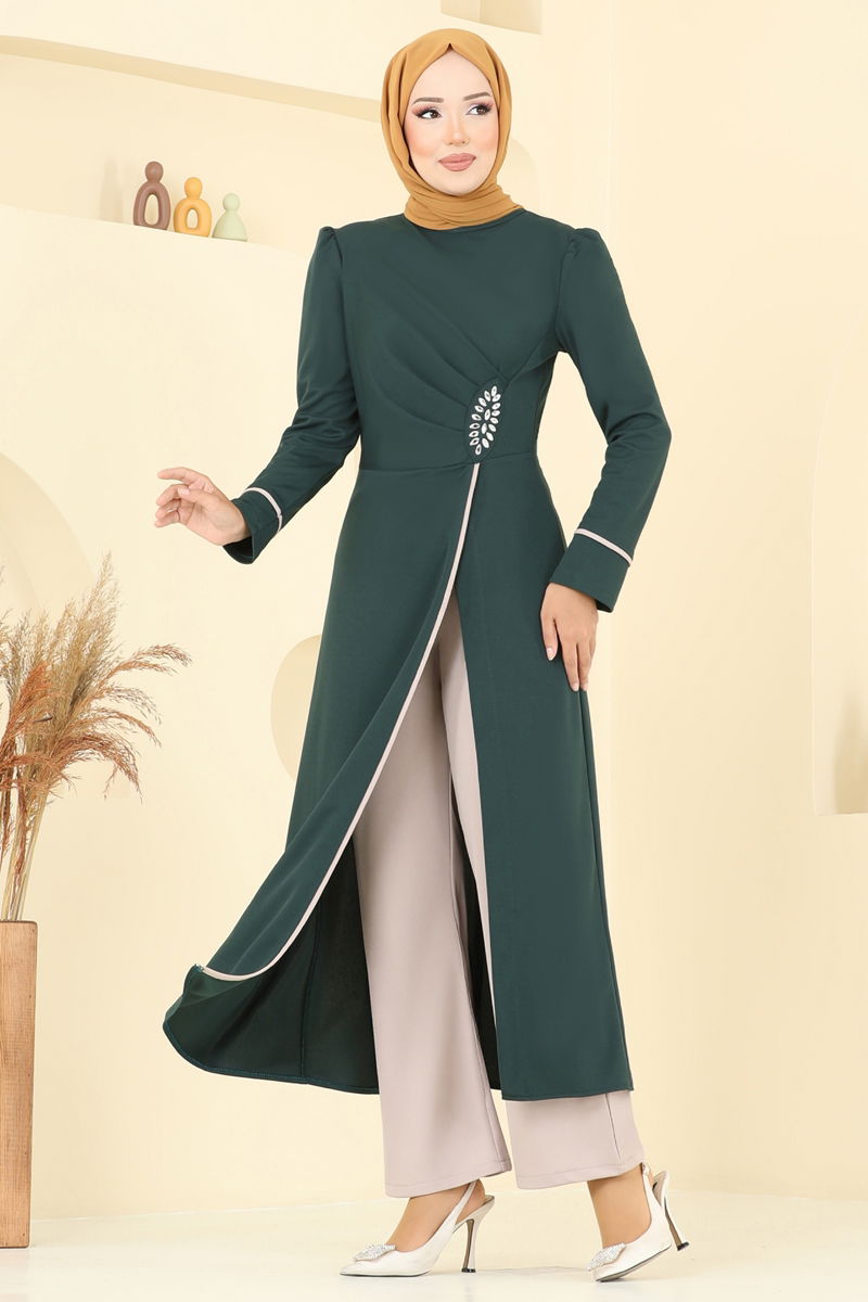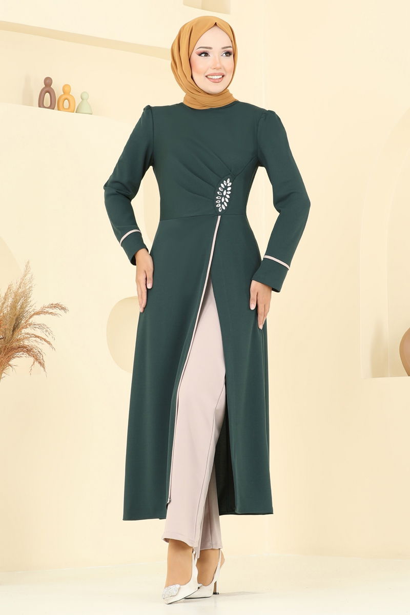 The Stone Detailed Slit Suit is an elegant and modern designed modest wear combo. Suitable for all seasons, this outfit is crafted from special Dabil fabric that can be washed gently at 30 degrees. Its crew neck and zippered back design offer practical use, while the front slit on the tunic adds an extra touch of elegance. The elasticated waistband of the pants enhances comfort, and the stick-on stone details provide an eye-catching look.