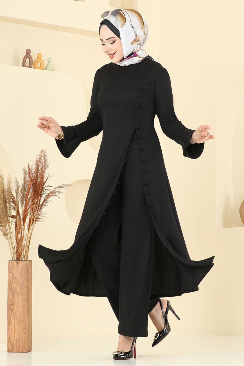 المنتج لديه ياقة دائرية. المنتج به أزرار نصف أمامي. الأزرار في الفتحات فعالة. غير مبطنة. المنتج به سحاب في جزء من الخلف. خصر البنطال مرن. قد يكون هناك اختلاف في الدرجة اللونية في المنتج بسبب التقاط الصور الفوتوغرافية.