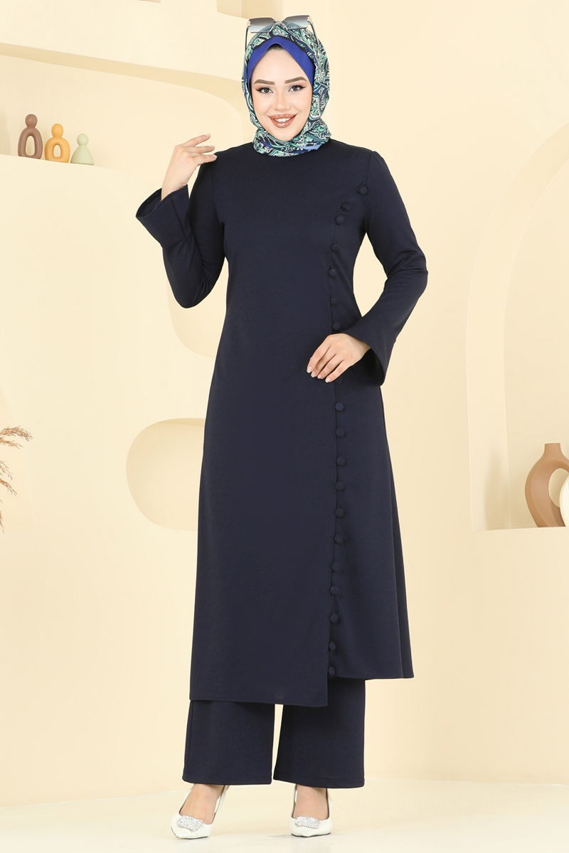 المنتج لديه ياقة دائرية. المنتج به أزرار نصف أمامي. الأزرار في الفتحات فعالة. غير مبطنة. المنتج به سحاب في جزء من الخلف. خصر البنطال مرن. قد يكون هناك اختلاف في الدرجة اللونية في المنتج بسبب التقاط الصور الفوتوغرافية.