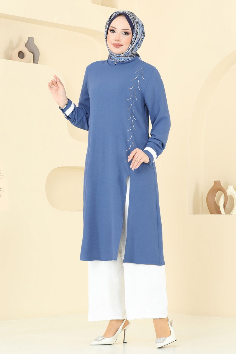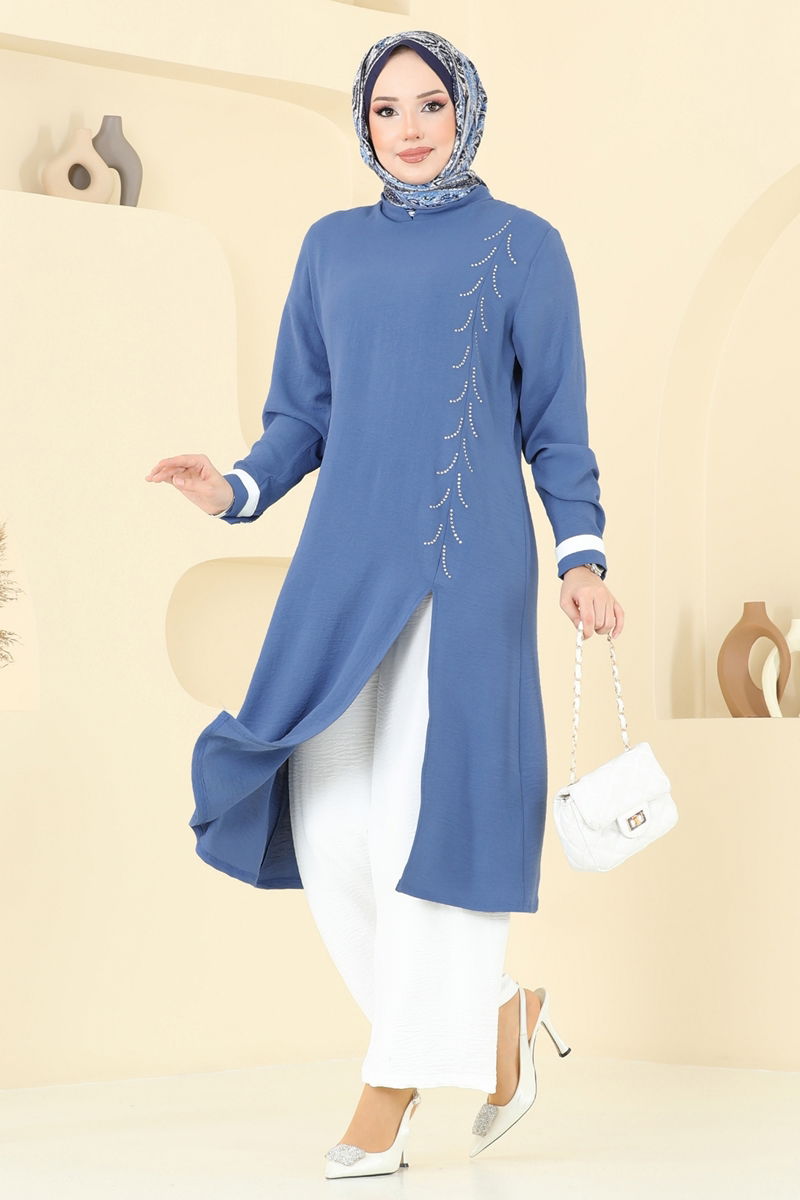 Product Feature : It is a new season hijab fashion product. The product is worn on the head. The product has a Half Judge collar. It has a slash.. Unlined. The product has a zipper at the from the back part. The stones are glued. The waist of the trousers is elastic. Cuff buttons are active. There may be a tonal difference in the product due to concept photo shoots.