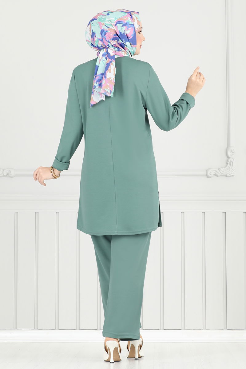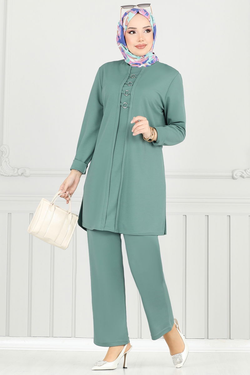 يتم ارتداء المنتج على الرأس. المنتج لديه ياقة دائرية. غير مبطنة. اكسسوار معدني لا يتغير للأغمق التفاصيل مخيطة. خصر البنطال مرن. قد يكون هناك اختلاف في الدرجة اللونية في المنتج بسبب التقاط الصور الفوتوغرافية.