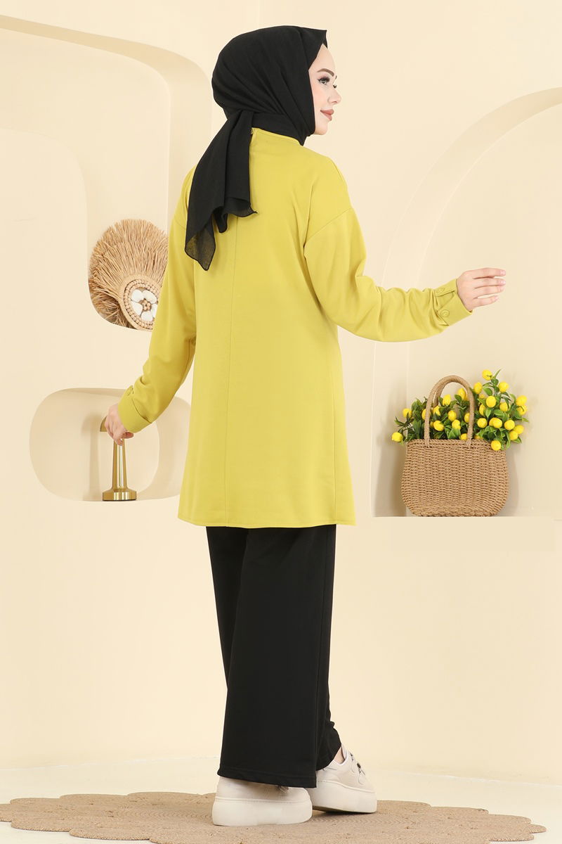 Our Slit Accessory Buttoned Suit is a stylish hijab outfit that can be comfortably worn in all seasons. Made from dual thread fabric, this ensemble features a bicycle collar tunic and elastic waist pants, offering both comfort and elegance. The front slit detail and accessory buttons on the cuffs complete the design. It can be washed at 30 degrees on a gentle cycle. The product on the model is size 38 and has a usable button at the back.