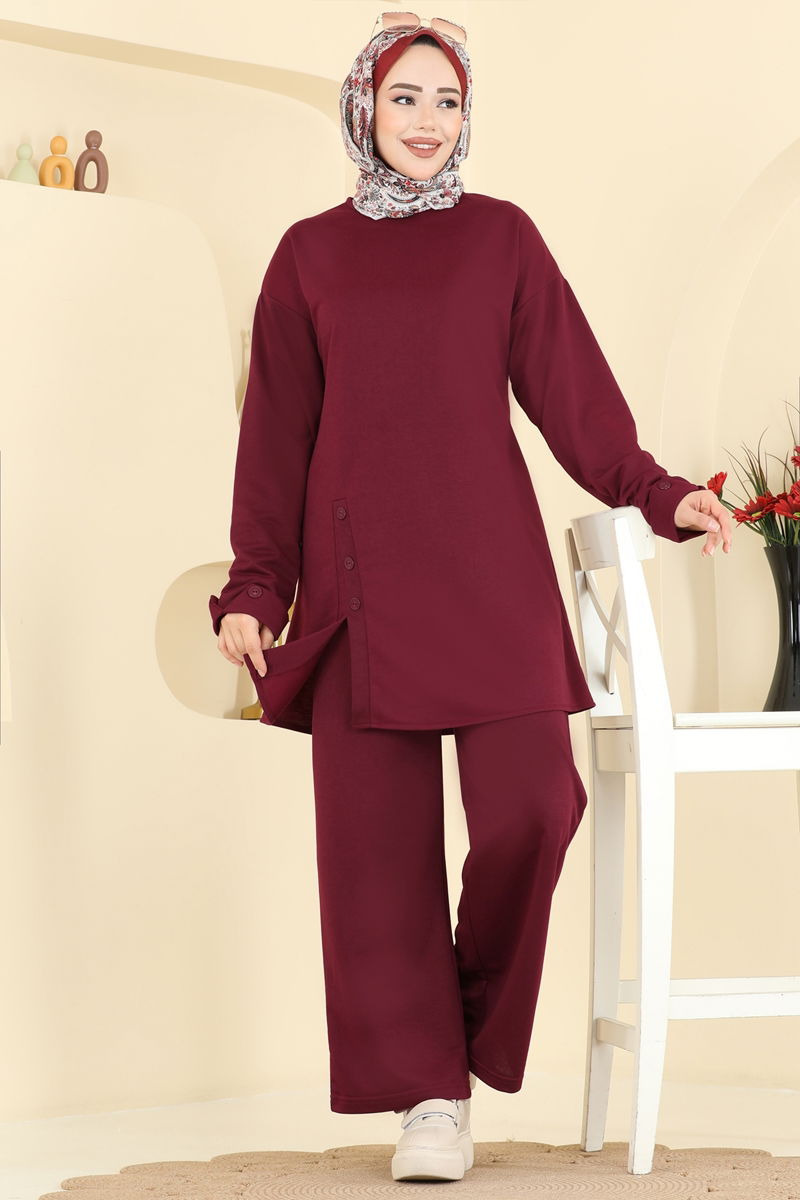 Our Slit Accessory Buttoned Suit is a stylish hijab outfit that can be comfortably worn in all seasons. Made from dual thread fabric, this ensemble features a bicycle collar tunic and elastic waist pants, offering both comfort and elegance. The front slit detail and accessory buttons on the cuffs complete the design. It can be washed at 30 degrees on a gentle cycle. The product on the model is size 38 and has a usable button at the back.