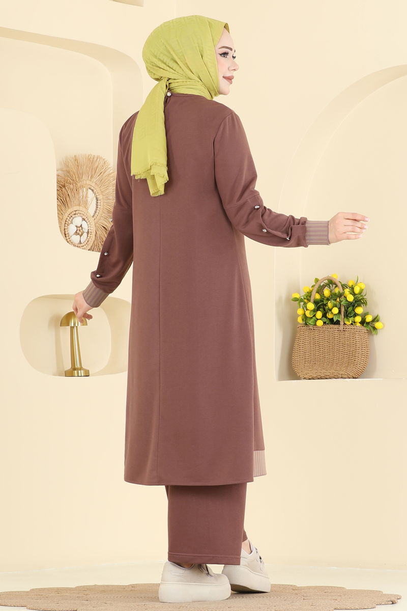 Product Name: Ribana Detailed Double Thread Set . This specially designed modest wear provides a style that can comfortably be used in all seasons. This product, which requires delicate washing, should be washed with water not exceeding 30 degrees. Made of double thread fabric, the set offers durability and comfort. With its bike neck, side-slit tunic, and elastic waist pants design, it presents a modern and chic look. The tunic features a functional button at the back and elegant lace details for aesthetic sophistication. The tunic and pants set combines comfort and style seamlessly.