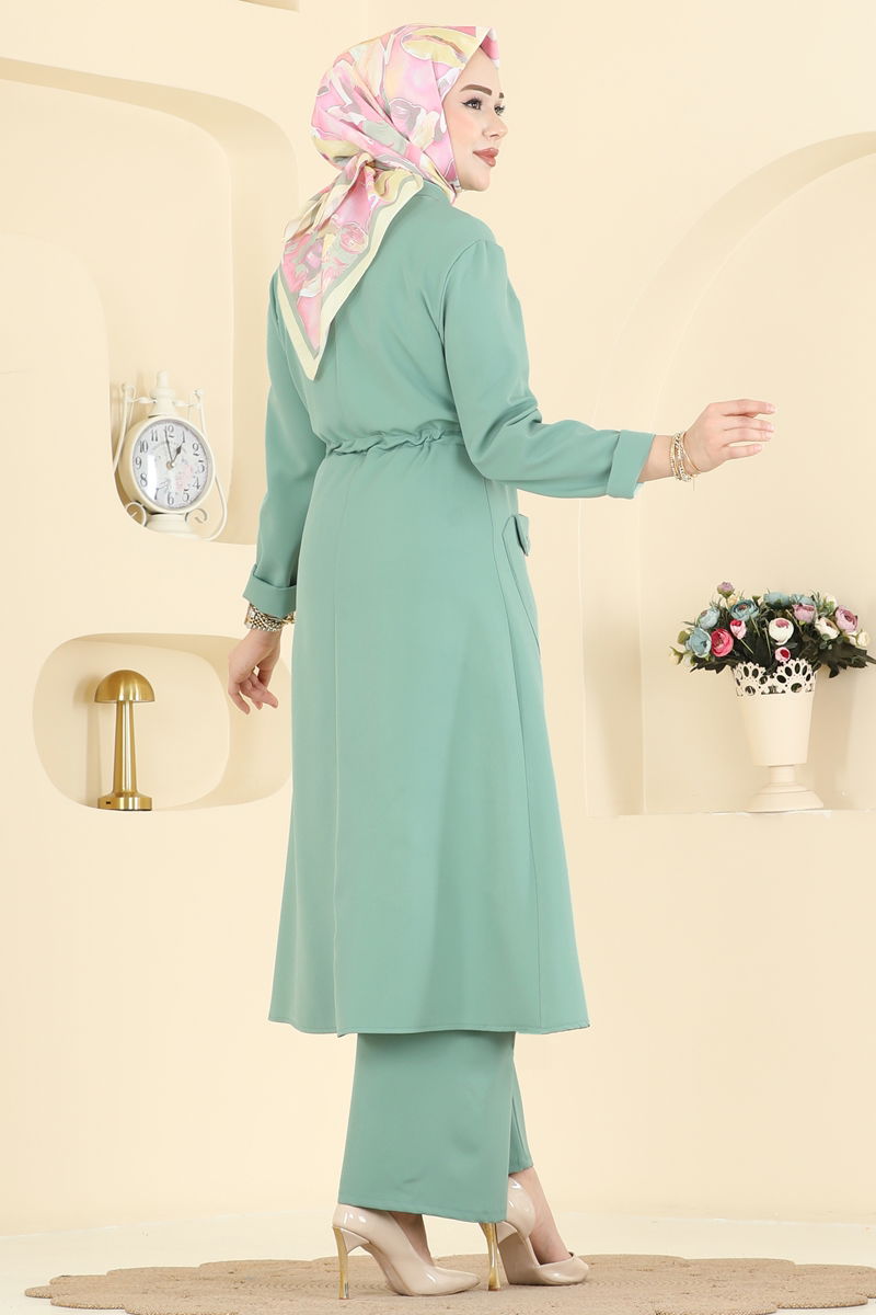 The Beli Tunnelli Dabıl Suit is a modest wear suitable for all seasons. It can be washed gently at 30 degrees, making it practical to maintain. Made from Dabıl fabric, this suit features a semi-Stand collar and front-button design. Its unlined structure offers light and comfortable wear. The drawstring waist and elastic pant waist ensure a perfect fit, while both the coat and pants have pockets, enhancing functionality.