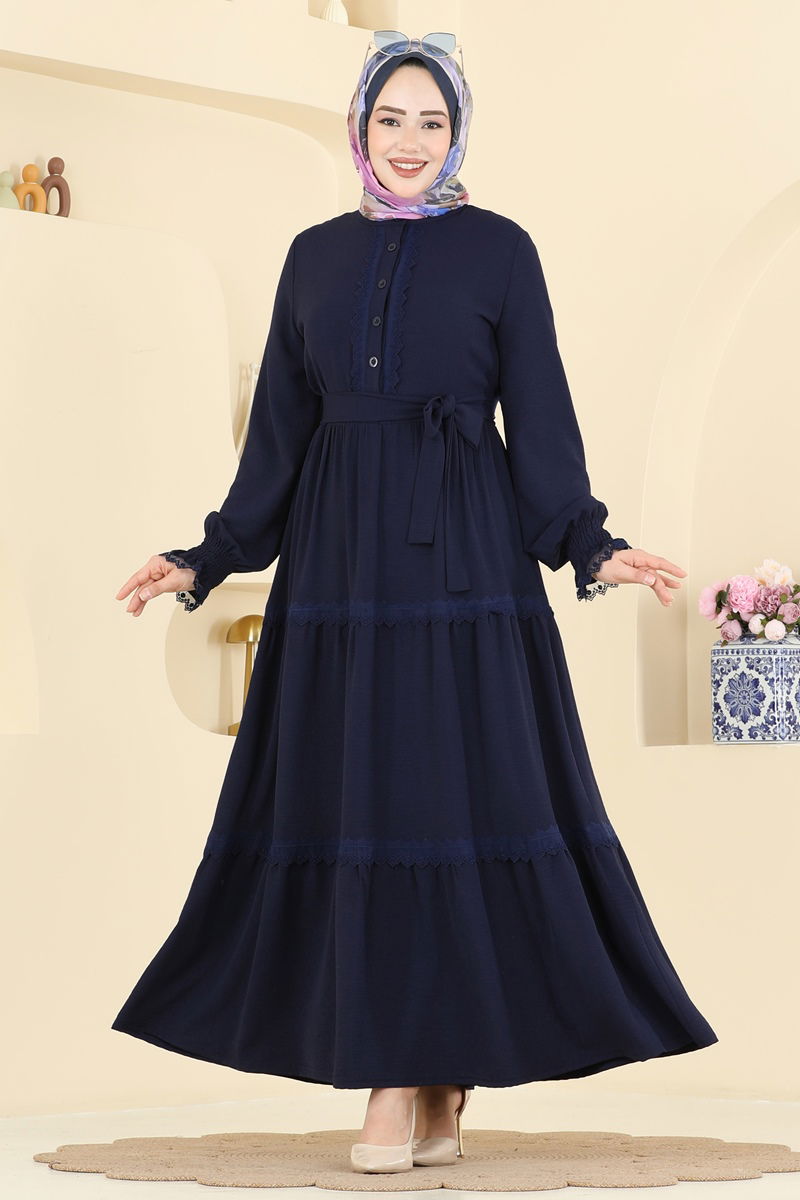 Ürün Detayları: Moda dünyasının yeni sezon tesettür koleksiyonundan bir parça. Model yarım hakim yakaya sahiptir. Ön kısmı yarım düğmeli tasarıma sahiptir. Dantel süslemeler elbiseye zarif bir hava katmaktadır. Ürünün kemer geçirme bölümü bulunmaz. Kuşak elbisenin bir parçası olarak gelmekte ve kullanımı opsiyoneldir. Kol kısımları lastiklidir.Fotoğraf çekimlerinde yaşanan ışık farklılıkları ürün renginde değişikliklere sebep olabilir.