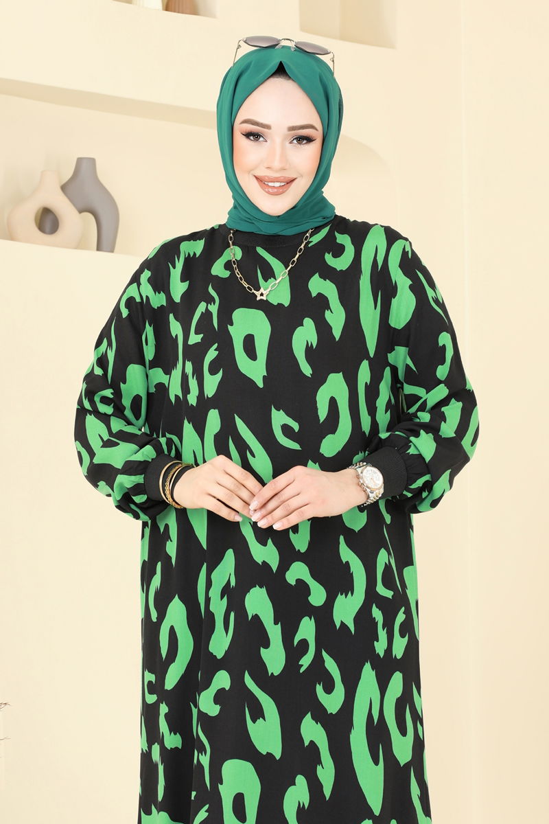 Yeşil Desenli Tesettür Elbise
