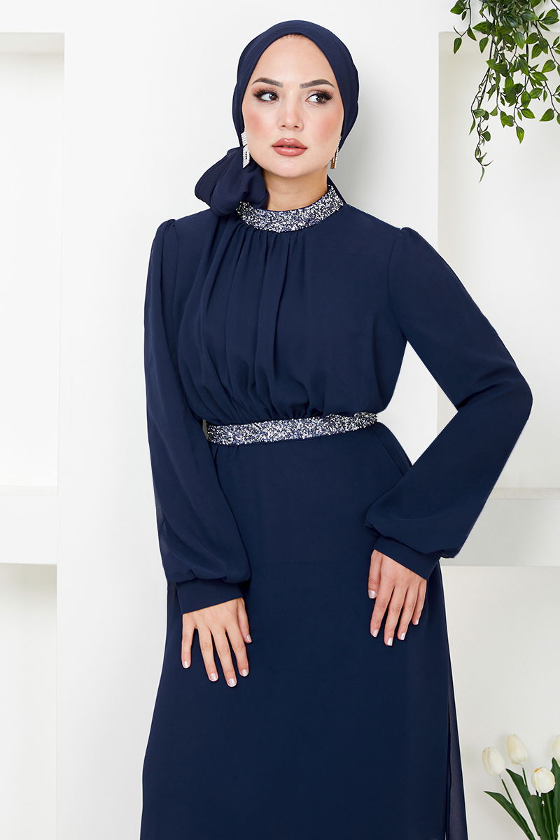 Tissu bleu marine à double combinaison Caractéristique: Le produit est fait de tissu en mousseline de soie.Longueur du produit: Tunique: 108 cm. Pantalon: 105 cm.Caractéristique du produit: C'est un produit de nouvelle saison. Le produit est vieux de quatre saisons. Il est doublé. Le juge est le collier. Il a une fermeture éclair cachée à l'arrière et un seul bouton. Les pierres sont de la colle. La taille du pantalon est élastique. Le produit est envoyé en deux parties sous forme de tunique et de pantalon Instructions de lavage: un lavage à 30 degrés doit être effectué. Dimensions du mannequin Taille: 1,67 (Sans chaussures) Poitrine: 80Bel: 68Basen: 96le produit sur l'homme est de taille 38REMARQUE: Le moule du produit est un moule individuel, il est recommandé de commander votre propre taille. Il peut y avoir de légères différences de tons dans les couleurs des produits en raison des photos conceptuelles.Tags