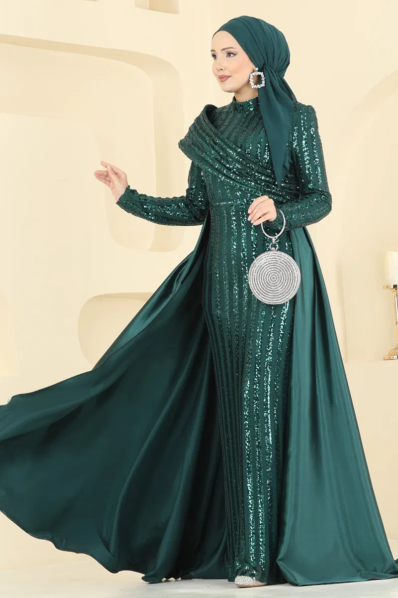 Zümrüt Yeşili Pul Payetli Drapajlı Abiye