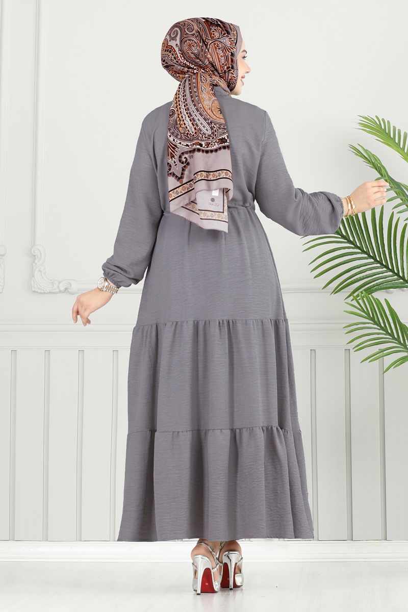 The Half-Buttoned Dress is a modest wear model suitable for all seasons. Washable at 30 degrees on gentle cycle, this elegant dress is made from sofia linen fabric. It has a semi-mandarin collar and front button details. The unlined model has elastic cuffs, and it comes with an attached belt, offering both comfort and style. The product shown on the model is size 38.