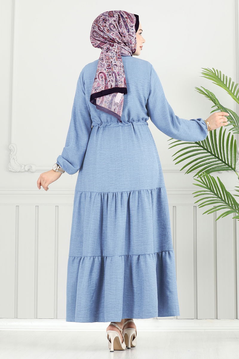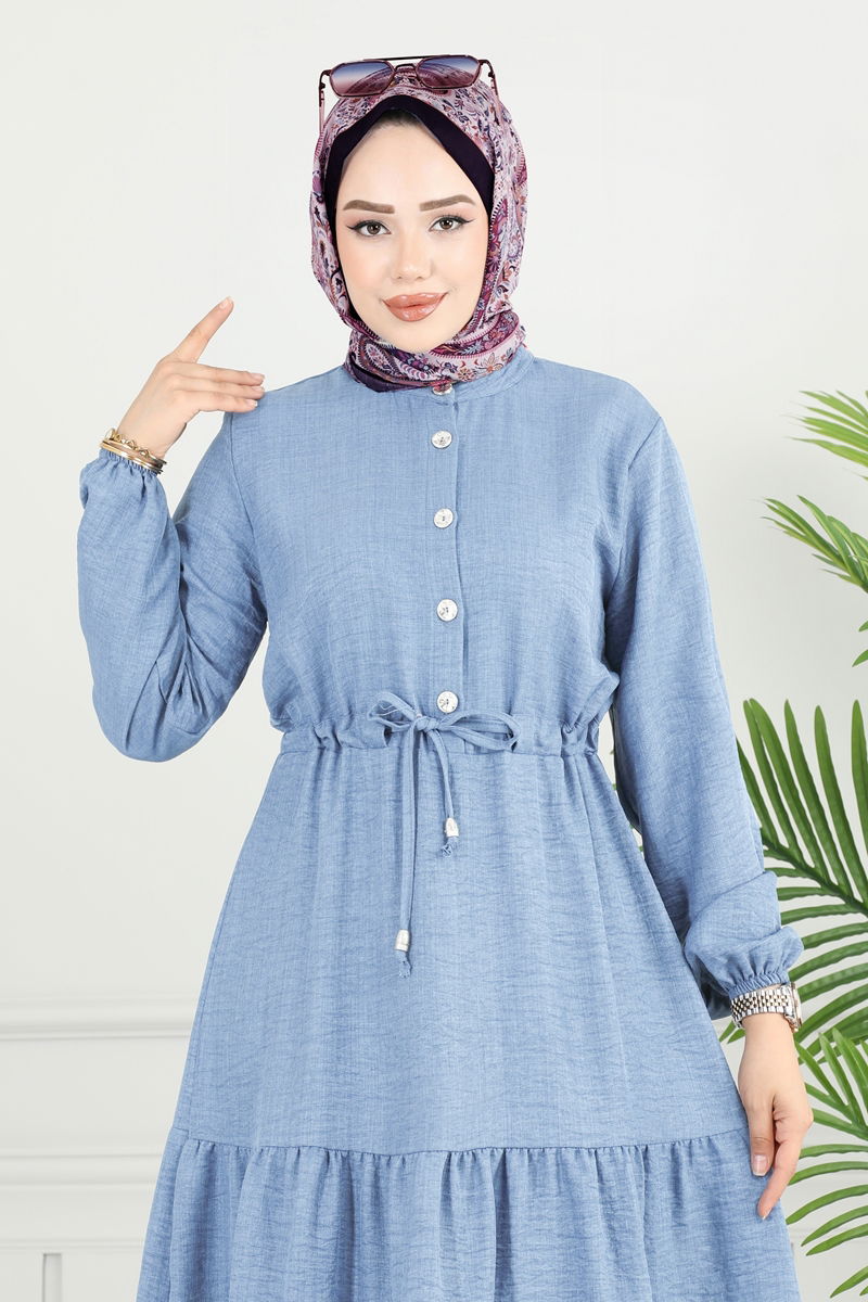 The Half-Buttoned Dress is a modest wear model suitable for all seasons. Washable at 30 degrees on gentle cycle, this elegant dress is made from sofia linen fabric. It has a semi-mandarin collar and front button details. The unlined model has elastic cuffs, and it comes with an attached belt, offering both comfort and style. The product shown on the model is size 38.