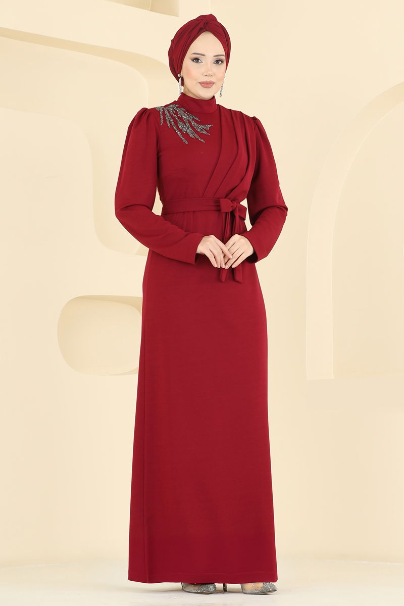 The Stone Detailed Crepe Dress combines elegance and style, perfect for all-season wear. Made from special knit crepe fabric, it offers both comfort and a chic look. The half-mandarin collar design adds a modern edge, while the hidden zipper at the back ensures practicality. The stone embellishments lend a refined sparkle to the dress. This model should be dry-cleaned and is unlined. The drawstring can enhance the dress's elegance and is optional.