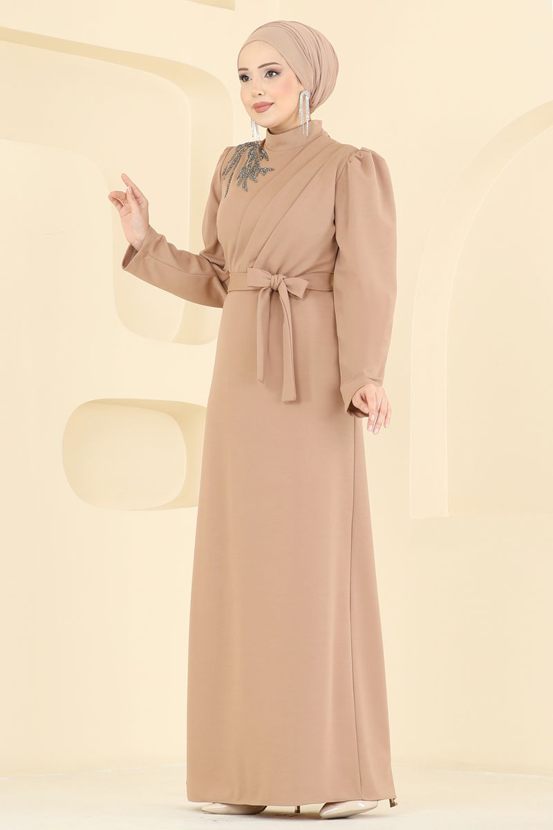 The Stone Detailed Crepe Dress combines elegance and style, perfect for all-season wear. Made from special knit crepe fabric, it offers both comfort and a chic look. The half-mandarin collar design adds a modern edge, while the hidden zipper at the back ensures practicality. The stone embellishments lend a refined sparkle to the dress. This model should be dry-cleaned and is unlined. The drawstring can enhance the dress's elegance and is optional.