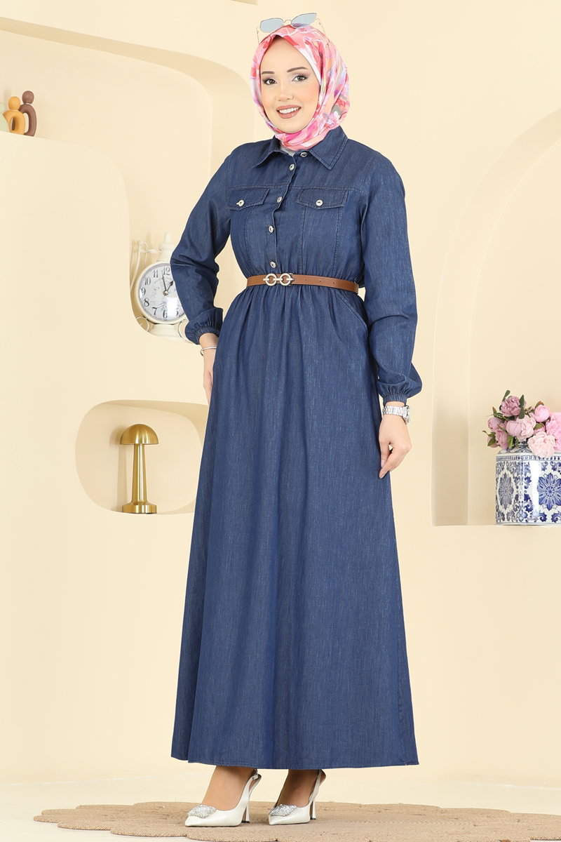 Elegant and comfortable, the Elastic Waist Denim Dress is perfect for all seasons. Washable at 30 degrees on a gentle cycle, this dress is made from durable denim fabric. It features a shirt collar design and half-buttons on the front, offering a modern look. The elastic waist detail adapts to different body types, enhancing comfort. The included belt can be customized to suit your style. Designed for both function and fashion, this dress comes with elastic cuffs and a chest pocket detail, providing a chic and comfortable option for modest dressing.