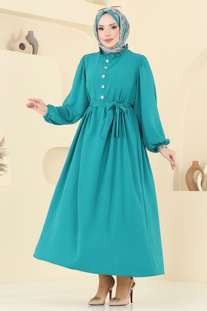 The Accessory Buttoned Hijab Dress is a versatile garment suitable for all seasons. Made from aerobin fabric, it features a ruffle collar and is unlined for comfort. The dress is designed to be slip-on, with decorative buttons. The belt included can be optionally worn, firmly stitched at both ends with a stitch-free middle section. Elastic cuffs complete this piece, shown here in size 38.