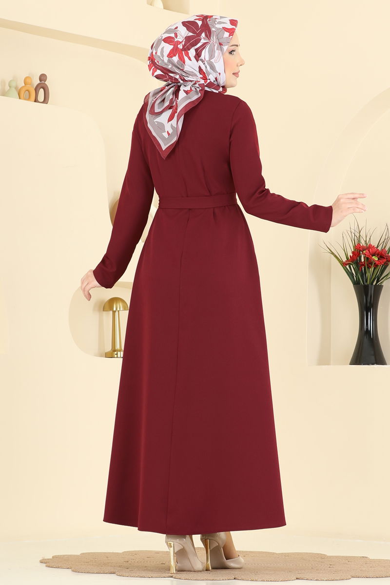 The Nervure Detailed Dabil Dress is a modest wear piece suitable for all seasons. It can be cleaned gently at 30 degrees. Made from Dabil fabric, this elegant dress offers comfort with its crew neck and zip-up back. Its lining-free design, stitched waist details, and belt design lend a modern look. The belt is specifically designed with sewn ends and an unstitched middle to prevent wavering and comes with the dress but can be optionally omitted.