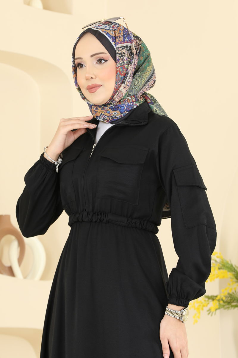 The Belted Modest Dress offers both style and comfort for all seasons. Made from a mix of Modal and Tensel fabric, this dress offers a soft touch and high durability. Its upright collar and unlined structure provide a comfortable wearing experience. Featuring a practical front zipper and elastic waist, it ensures ease of dressing. With pockets included, the dress becomes more functional while elastic cuffs add to its ease of use. The belt, which enhances the dress's elegance, can be optionally used and features fixed ends with an unstitched middle section for a smooth appearance. It can be washed gently at 30 degrees.