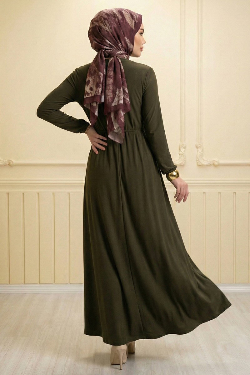 The Sandy Dress with lace details is a chic and modern modest wear option. Suitable for all seasons, this dress can be washed delicately at 30 degrees Celsius. Made from Sandy fabric, it features a crew neck and is unlined. The waist of the dress is stitched, and the cuffs are elastic. The product on the model is size 38, but the lace detail can be optionally removed or attached, allowing for versatility in style.