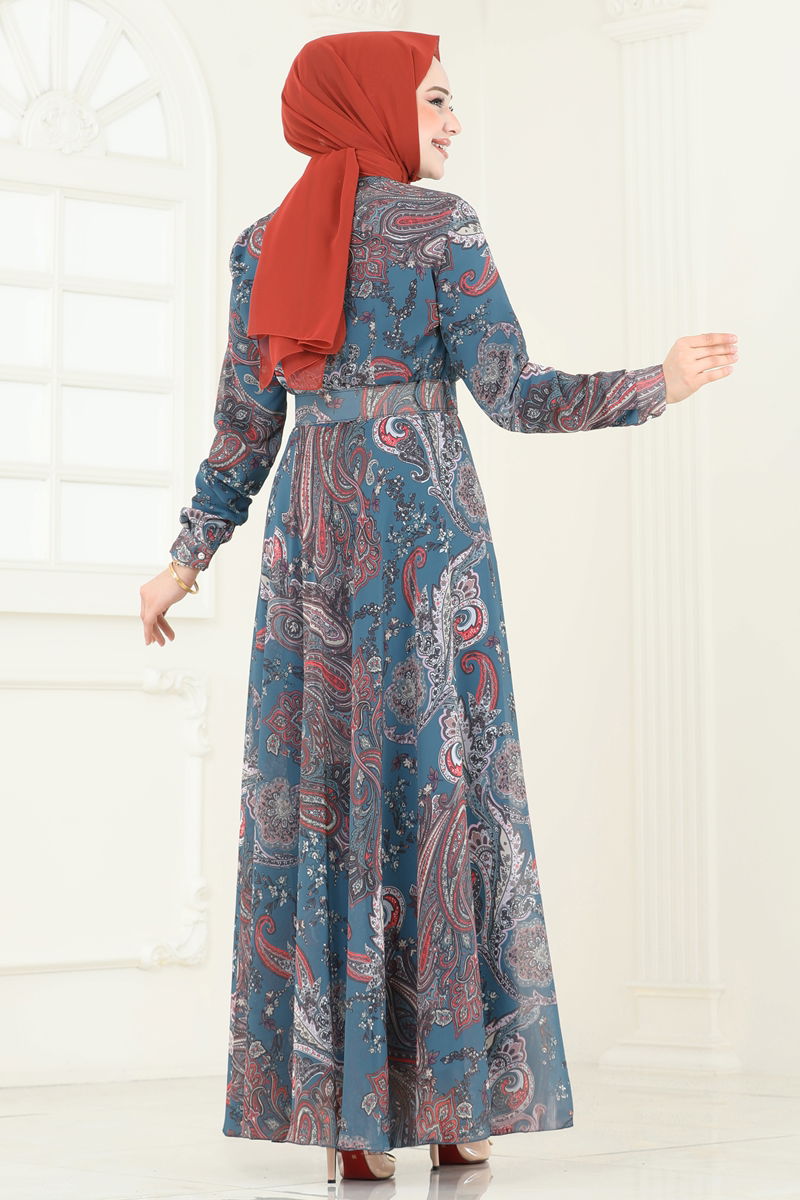 The Coated Belted Chiffon Dress is a stylish modest wear that can be comfortably worn across all seasons. It can be washed in a gentle cycle at 30 degrees Celsius. Made from chiffon fabric, this dress features a mandarin collar and is lined for added comfort. The side zipper makes it easy to wear, and it comes in a standard size 38. The belt is a significant detail that completes the elegance of the dress and can be optionally removed. It is tailored to prevent any waving at the ends while the center remains stitch-free. The cuffs are functional and add a stylish touch. The dress measurements include a length of 165 cm, a chest of 88 cm, a waist of 68 cm, hips of 99 cm, and a weight of 56 kg. This dress is suitable for special occasions or everyday wear, offering an elegant appearance.