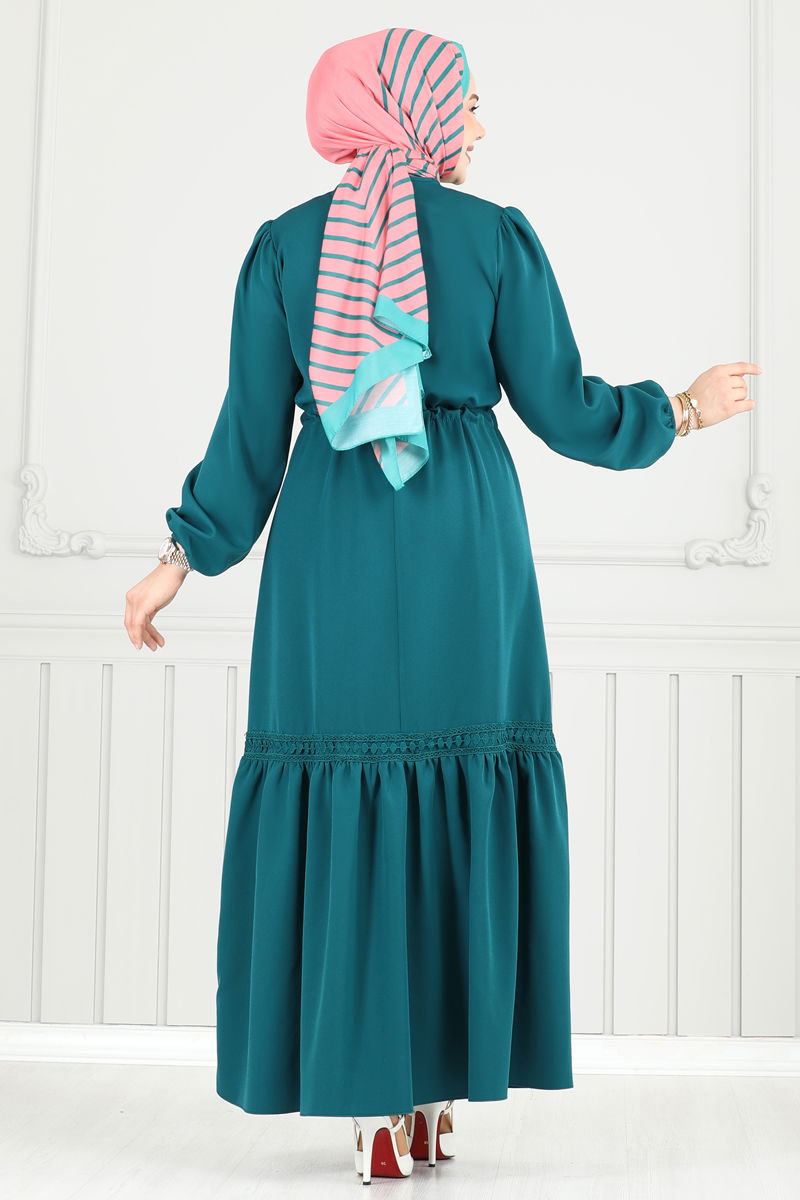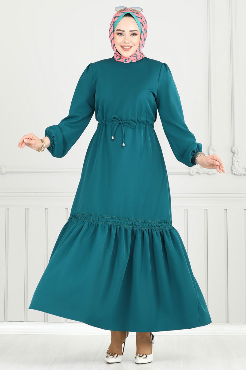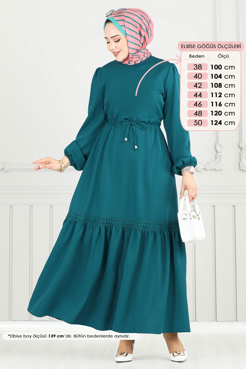The Belt Tunneling Hijab Dress is a modern and elegant choice that can be comfortably used in all seasons. With its delicate structure, it can be washed at 30 degrees and is made from soft dabıl fabric, providing comfort throughout the day. Its crew neck and zipper back design make it practical to use, while the drawstring waist adapts to different body sizes. The elastic cuffs and guipure details on the hem add a touch of elegance to the dress.